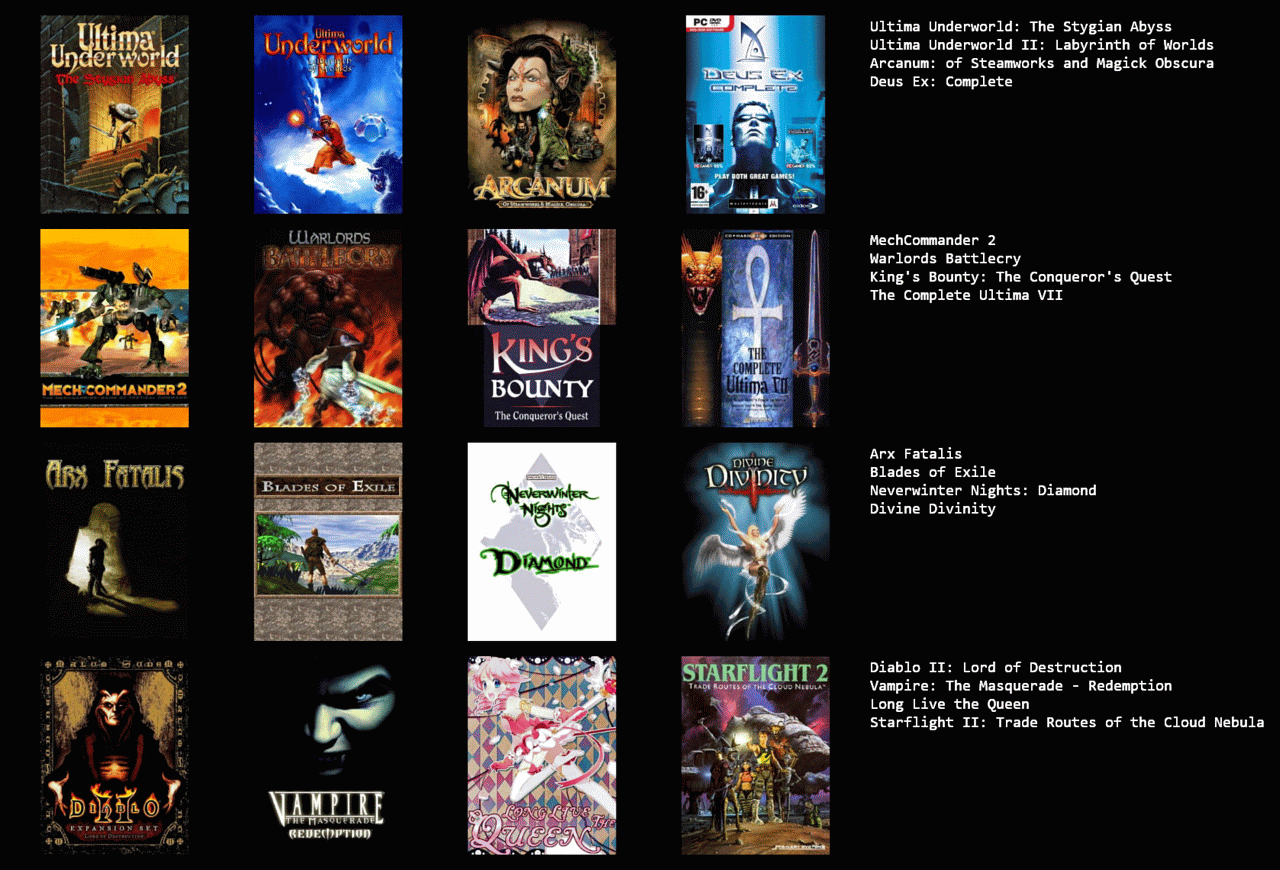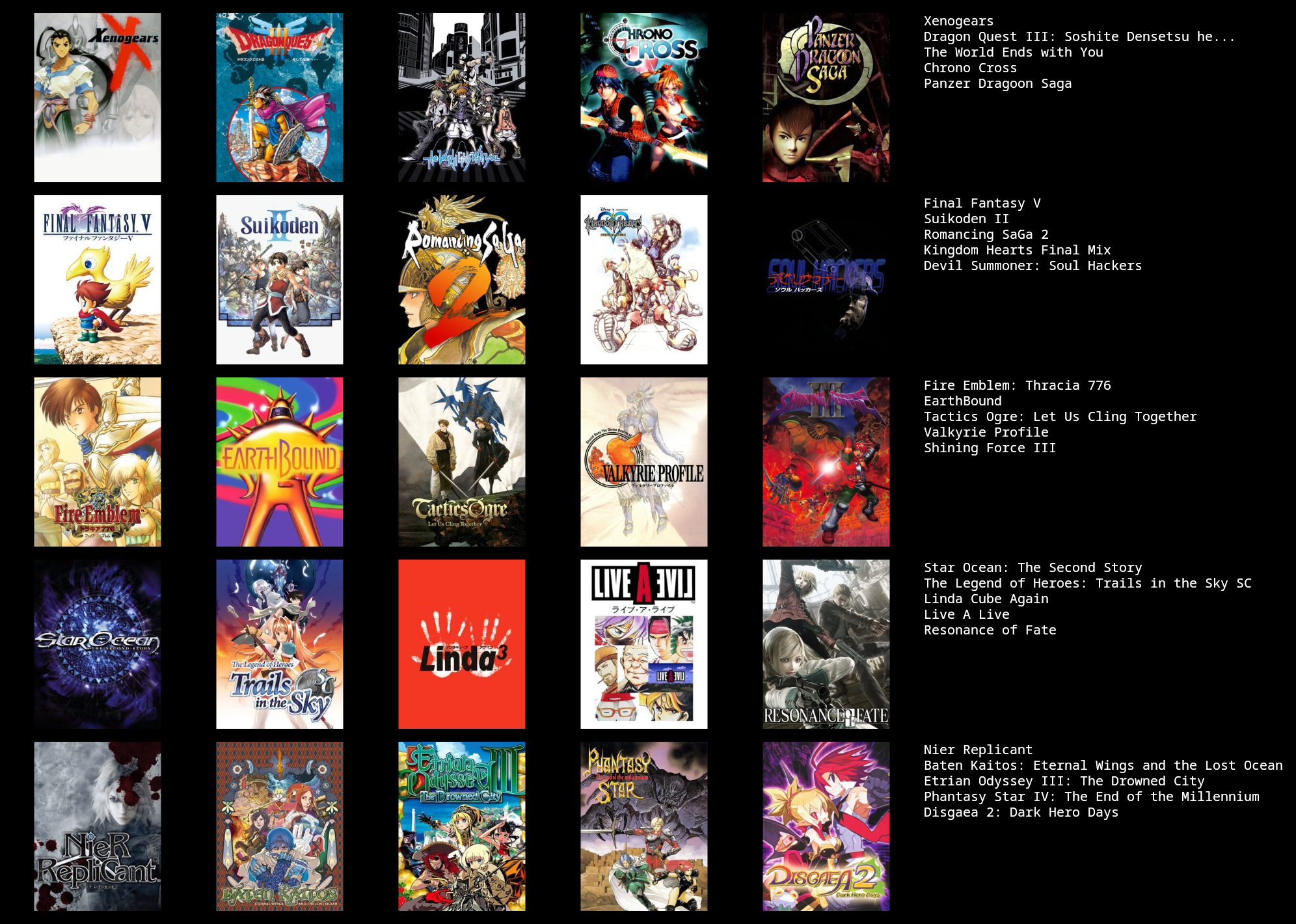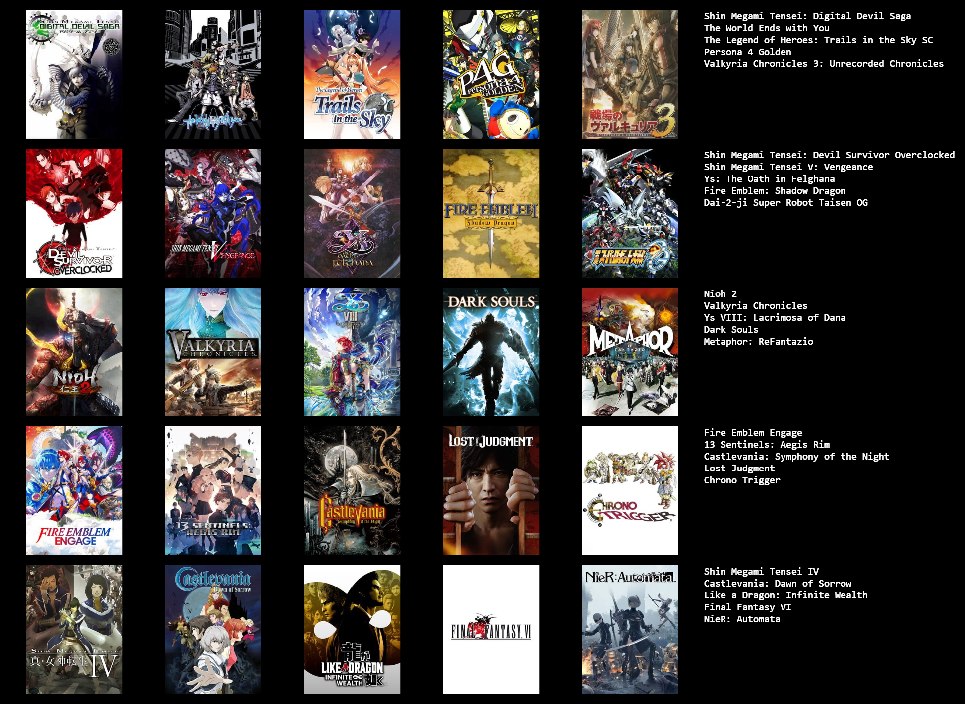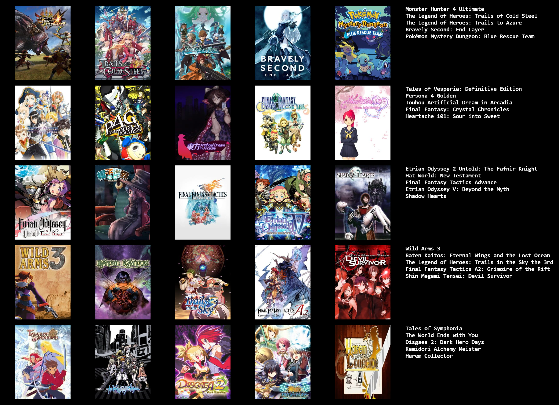 >>3932765I feel like I can only get up to 19/25 games, I could fill in the last 6 slots with jrpgs, but not jrpgs that I actually like enough to feel like it matters, like the seven final fantasies I didn't really like that much.I need to play the mother series, I think I should like at least 2 of those, maybe all 3.Going by other's 5x5s, maybe giving another chance to Legend of Mana, Dragon Quest games & Breath of Fire games, I dropped them when I last tried them though.Radiata stories and shadow heart I should probably play too.