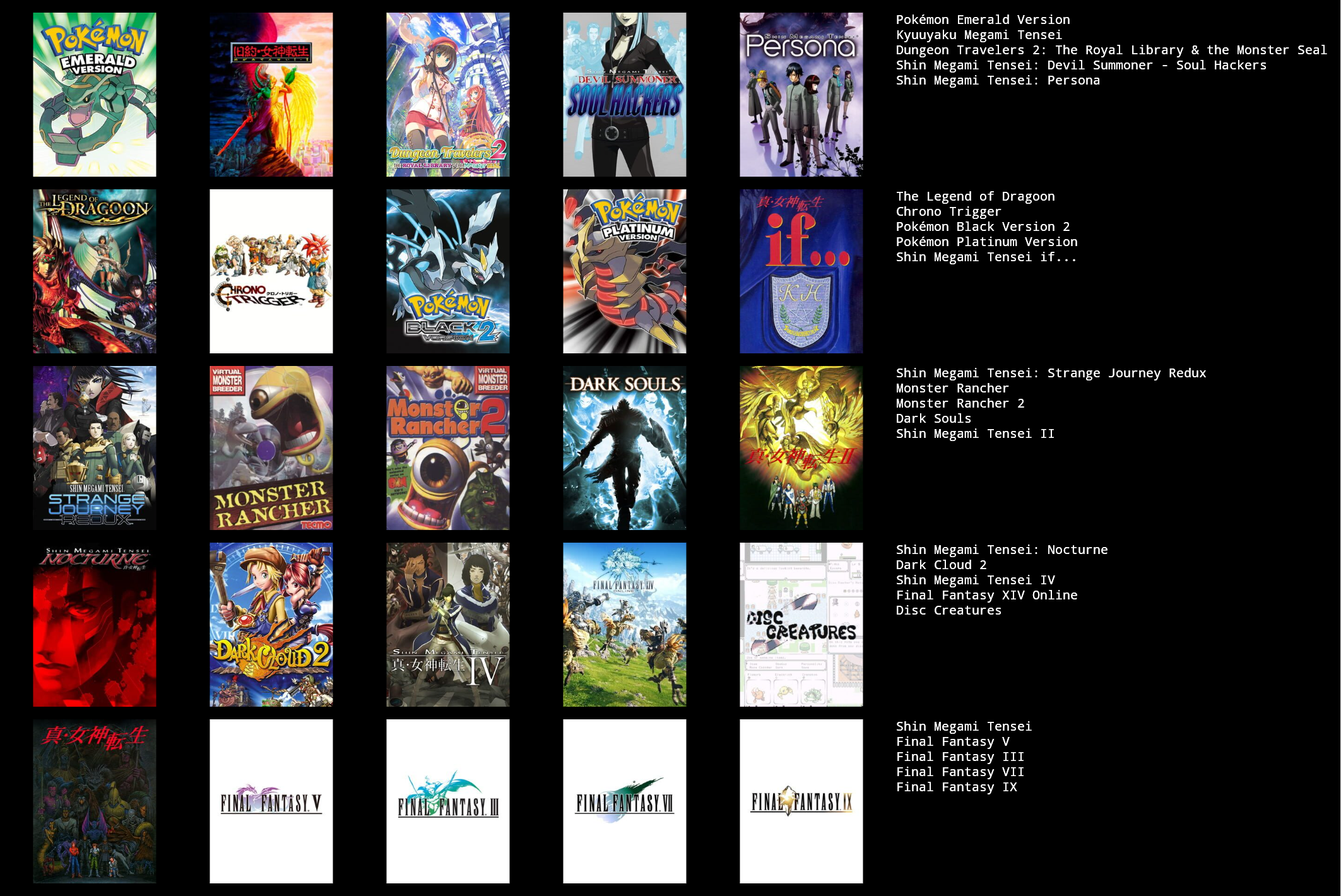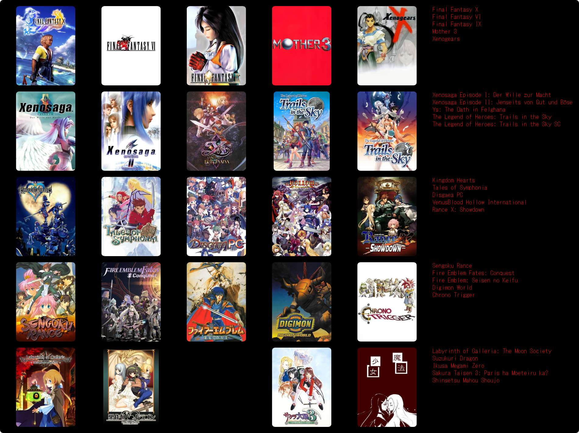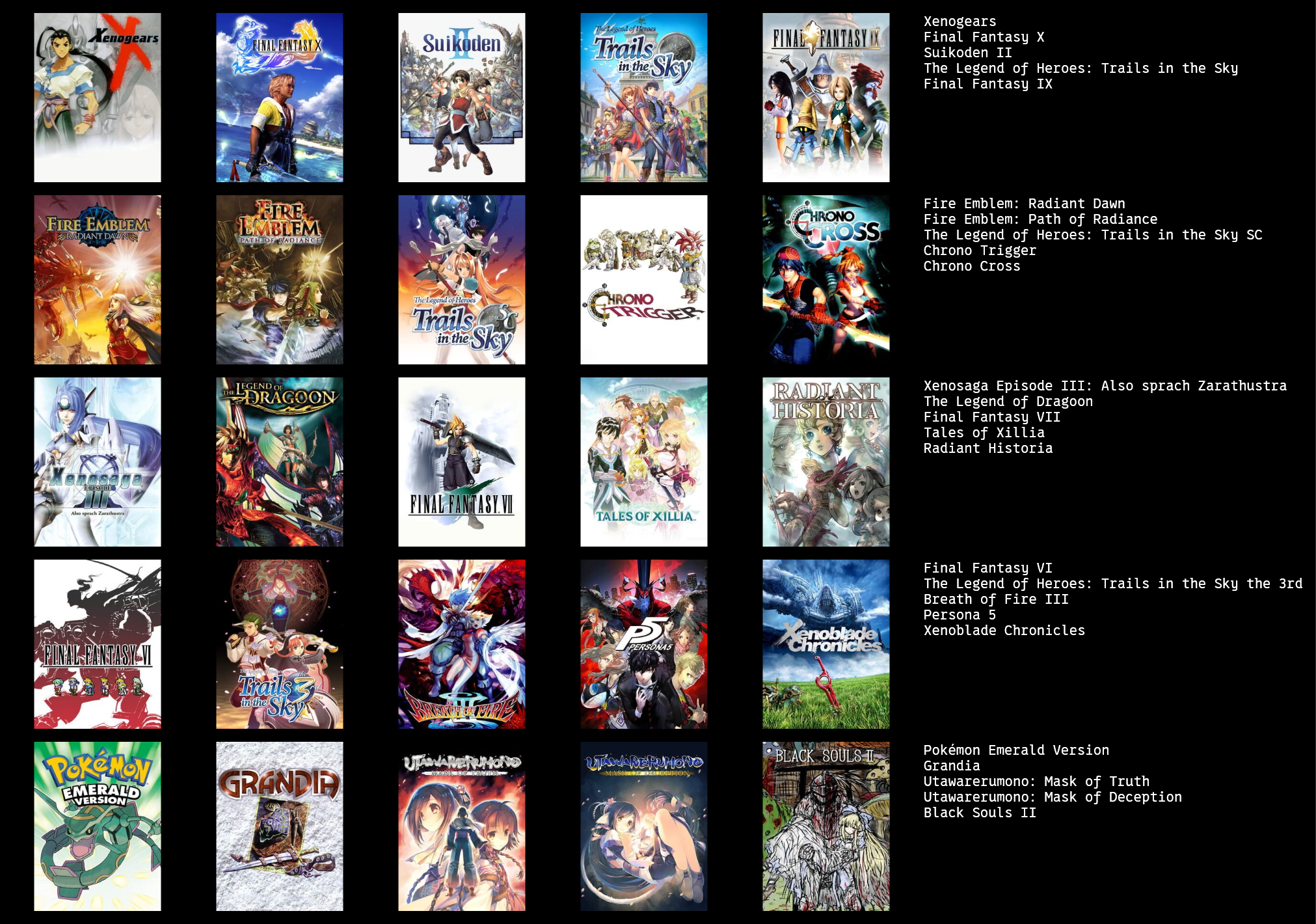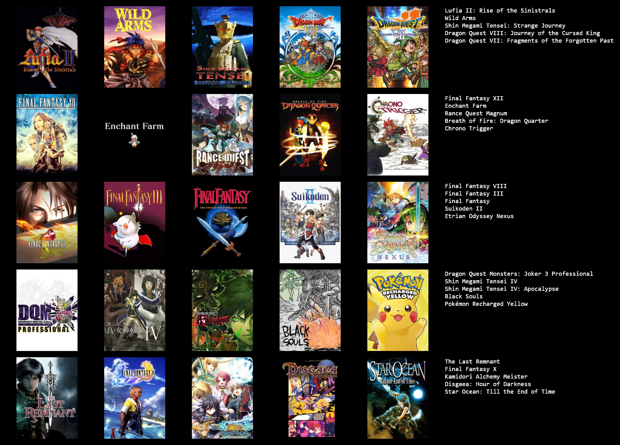 This would probably change around a bit if I put more thought in to it, or if I used a broader or narrower definition of JRPG.>>3933183I hadn't heard of Dark Half, but it sounds kind of interesting. I might give it a try at some point.