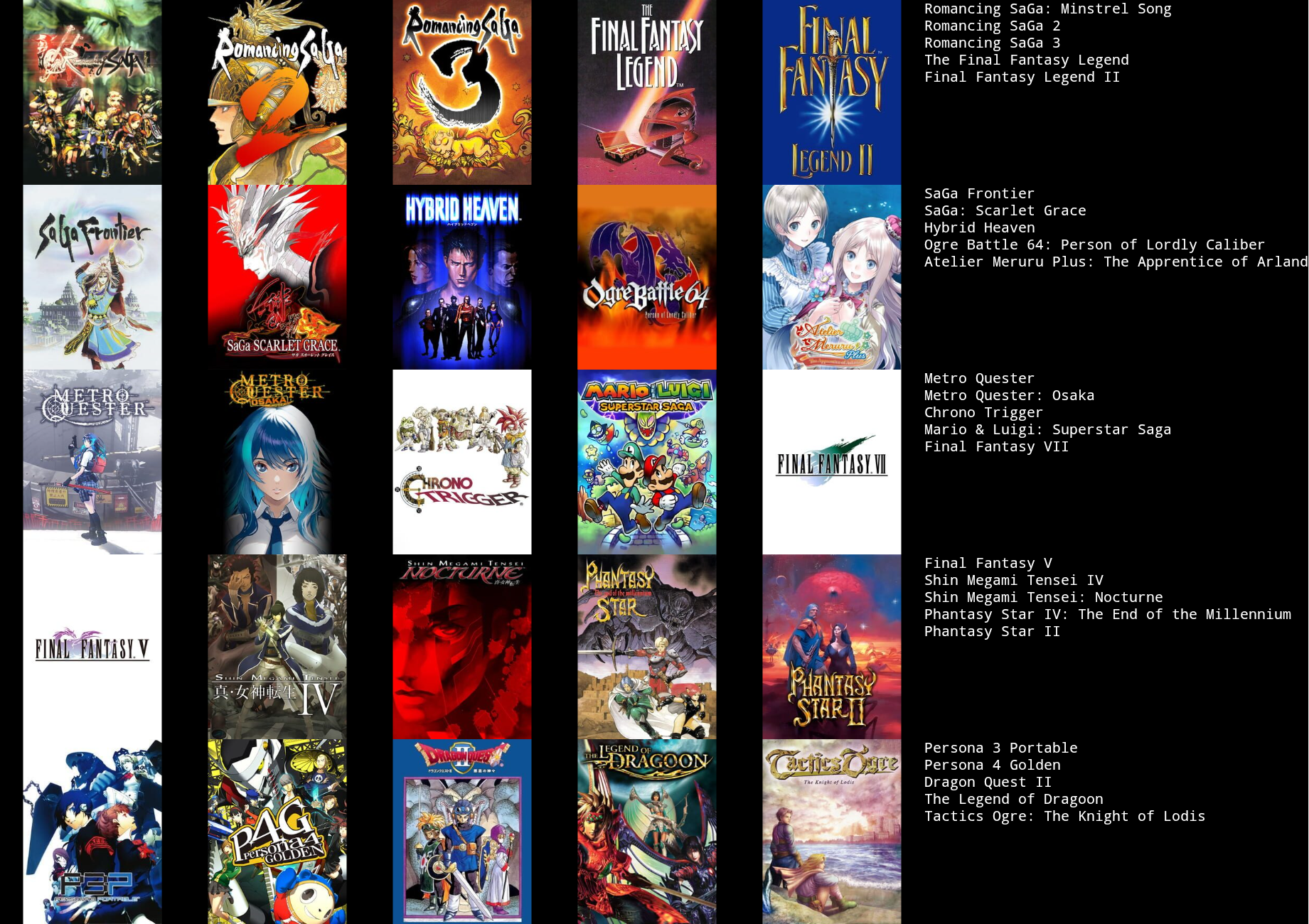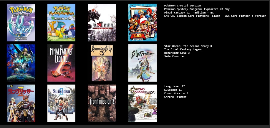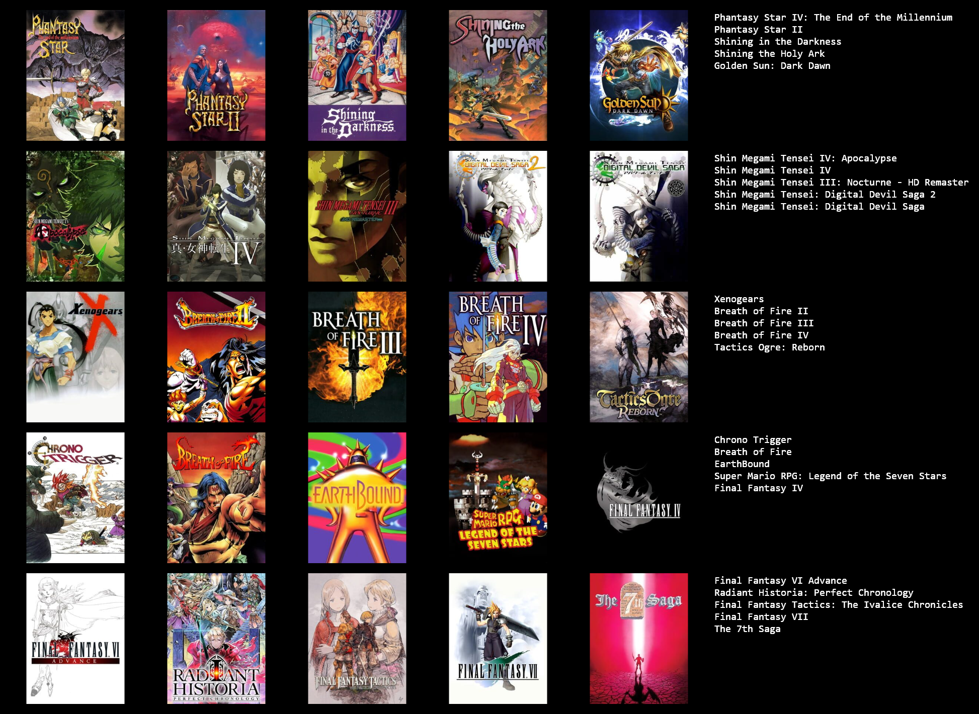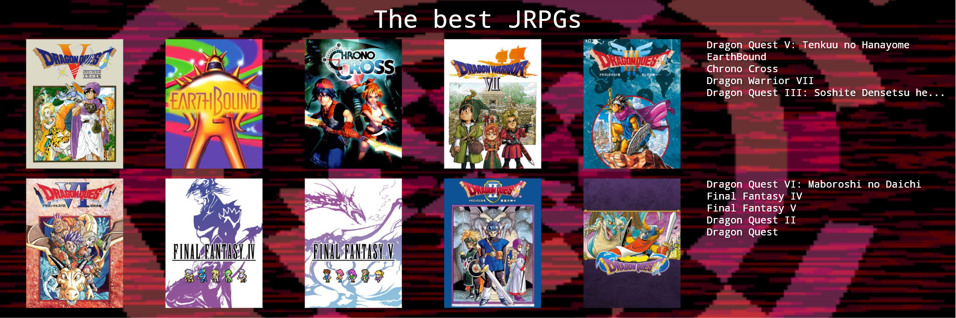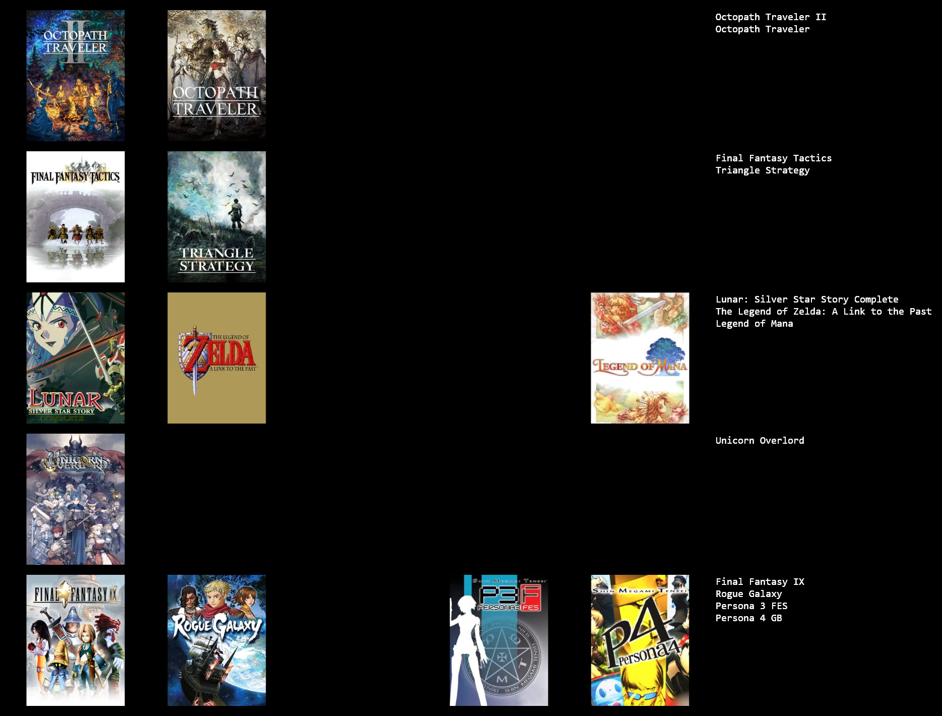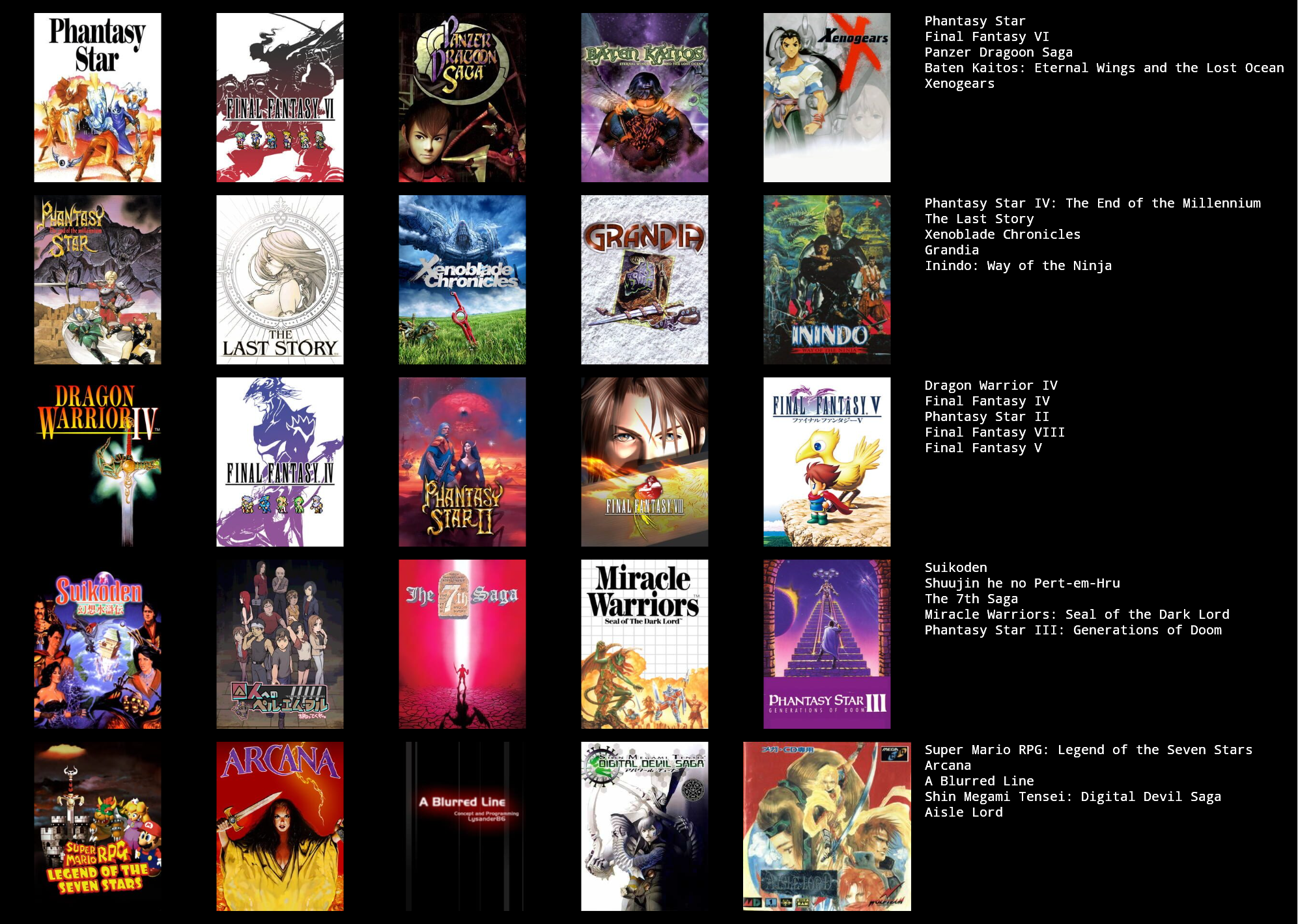 This would probably change around a bit if I put more thought in to it, or if I used a broader or narrower definition of JRPG.>>3933183I hadn't heard of Dark Half, but it sounds kind of interesting. I might give it a try at some point.