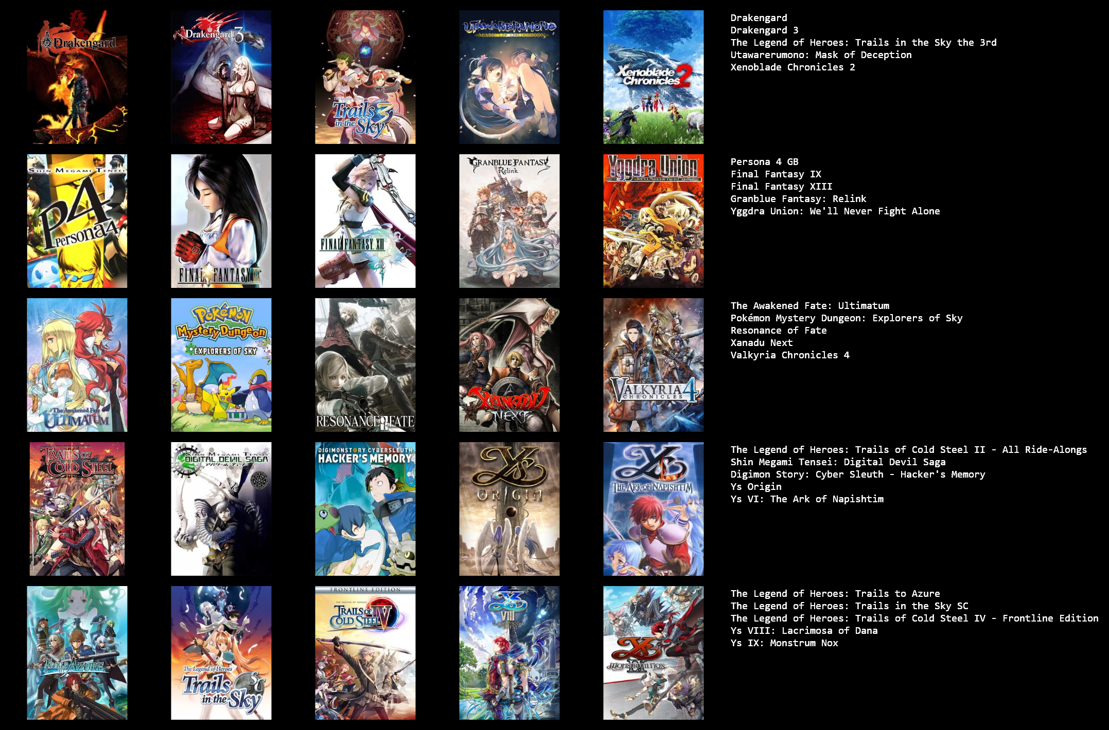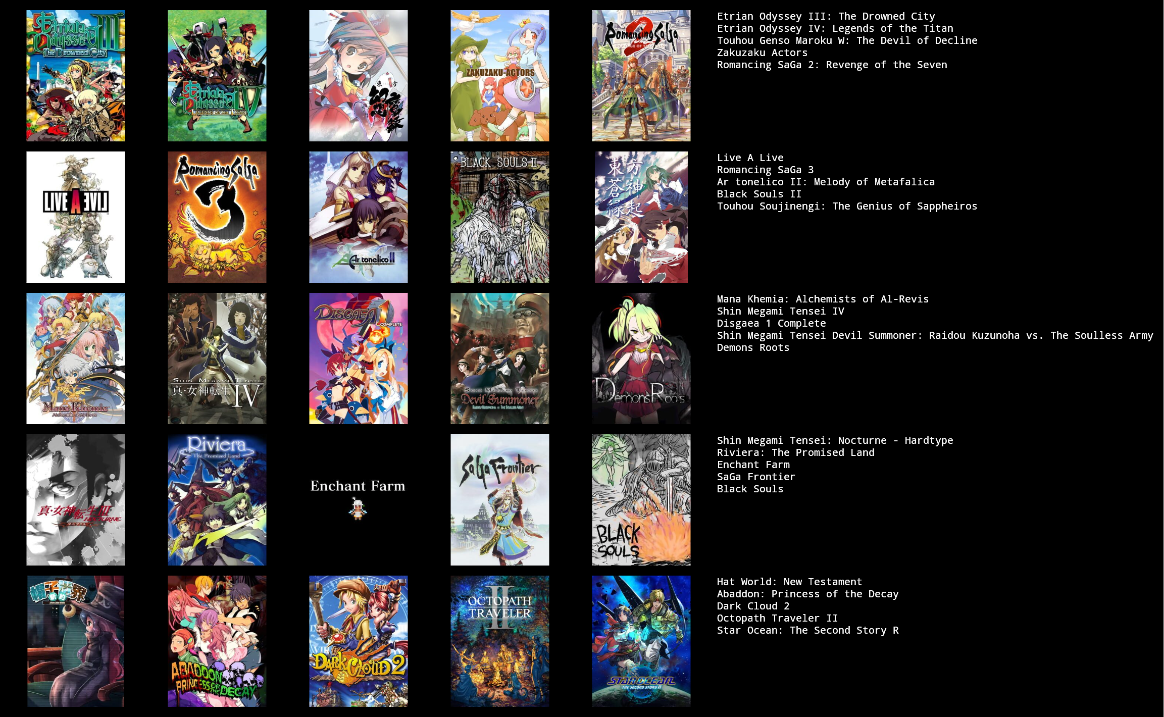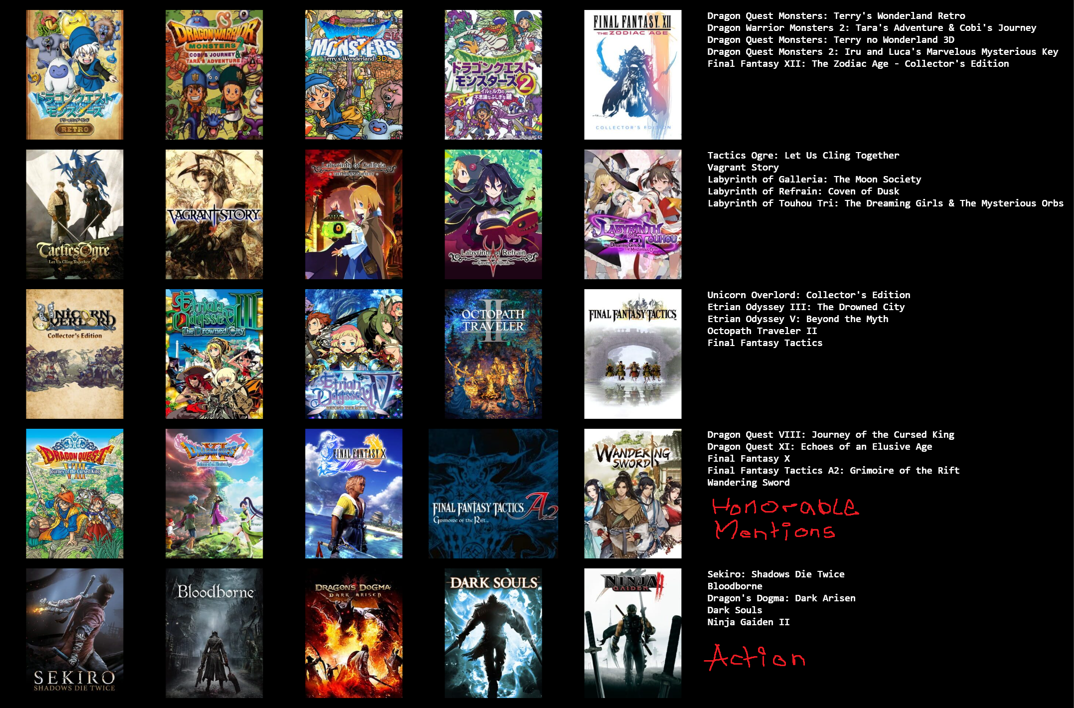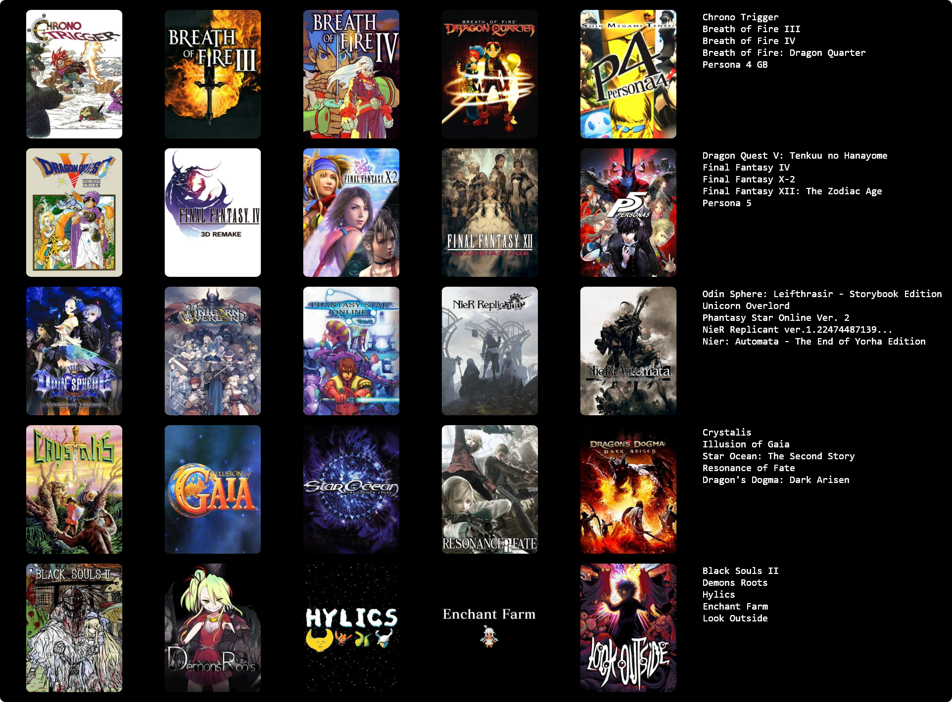 This would probably change around a bit if I put more thought in to it, or if I used a broader or narrower definition of JRPG.>>3933183I hadn't heard of Dark Half, but it sounds kind of interesting. I might give it a try at some point.