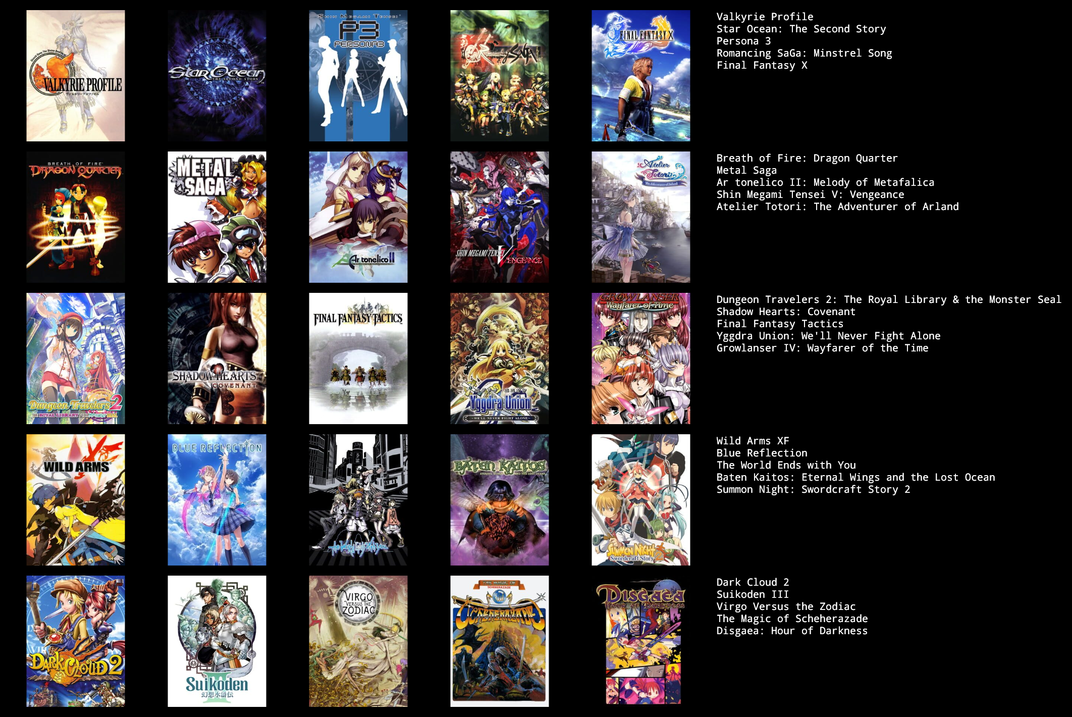 >>3943307What do you want me to say, man?I havent played suikoden 1 or 2, i plan to.Havent played xenogears but i plan to. Xenoblade gaems dont interest me and they are on nintendo consoles.Ive played persona 4 and 5, but i dont like them as much as 3.I prefer paper mario 64 to thousands year door. I didnt want to fill the entire chart with FF games as well. Between all the tactics games, i like A2 the most.Havent played wild arms but i plan to.I want to try Etrian oddisey one of these days as well.Im not interested in SMT, the aesthetics dont attract me.I didnt like metaphor much. Exp33 is good but i wouldnt qualify it as one of my favorites.I played breathe of fire 3 and dropped it since i didnt like it much. I want to try 4 eventually. Havent played tails of ____.Trails games as well, the sky trilogy is excellent, and zero/azure are ok, but cold steel and onwards is pure slop.Havent played mother games, not usre if they are interesting to me.I played legend of dragoon but didnt like it much.