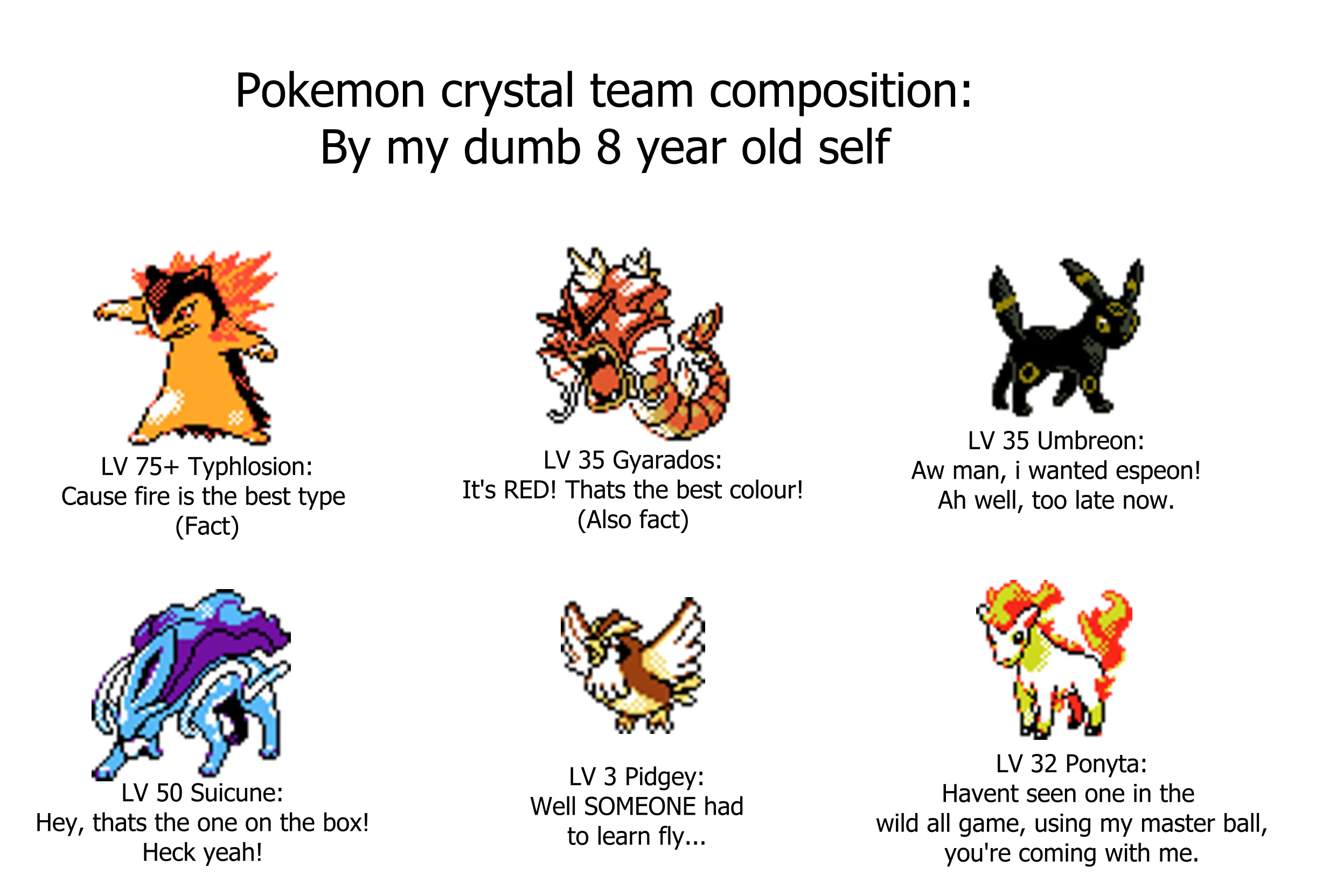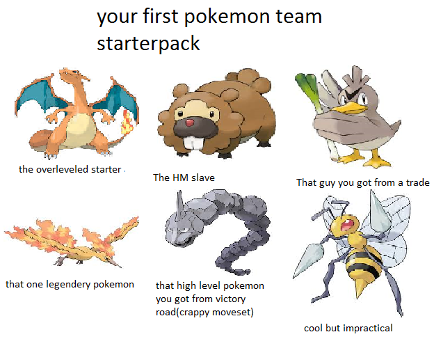 >>3944822See >>3944738It's common enough that there are multiple variations of this meme. I've seen many more than this, I just don't ever save them. It's the easiest way to play the game. It's how everyone played them. Catching Pokemon is extremely cumbersome, finding the Pokemon you want is extremely cumbersome, and then leveling up the Pokemon so that it doesn't die is extremely cumbersome. Even as a kid when I actually cared about catching Pokemon a little bit, all I did is catch them, I didn't actually use them because it's so much more effort to do that. And in normal JRPGs, if you get given a character who is a significantly lower level than the rest of your party, you usually benched that character if possible, and that's in a game where everyone in the party gets exp. Most people do not start with their weak Pokemon they want to level, then switch into their starter, then do that over and over again to level the new Pokemon. Even Exp. Share doesn't truly solve this issue. The newer games have Exp. All, but people complain about that too, that it makes the games too easy, because now your entire team is over leveled instead of just the starter. If you wanna play Pokemon the "real" way, it's way better to just play a difficulty romhack. You can actually lose in difficulty romhacks, and building teams is a lot less work. No breeding, no hatching eggs, no rolling for IVs, no farming EVs, no searching for the Pokemon you want that is the rare spawn on the route, etc. You also literally cannot beat them by just killing everything with your starter and maybe 1 other Pokemon like you can with the official games.