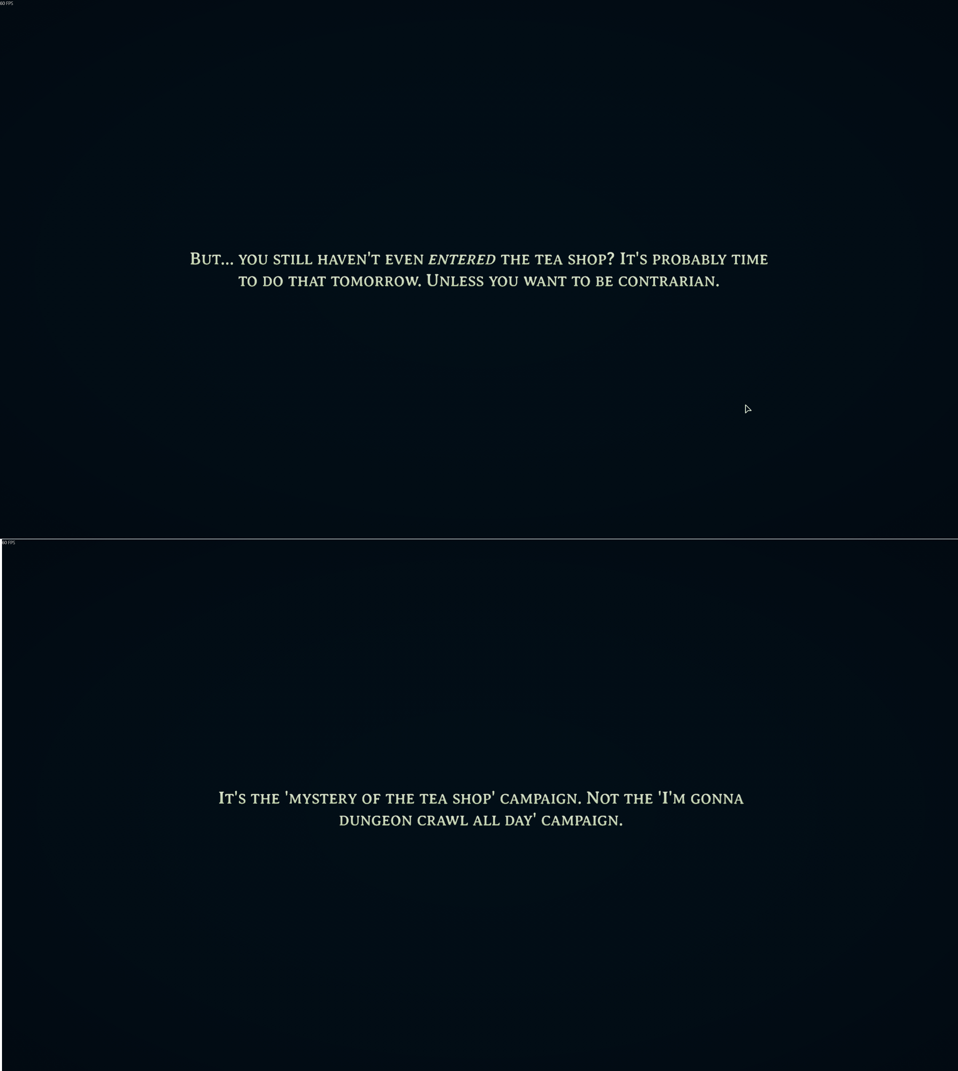 >>3938594I played the demo and I don't get the hype, I also never played Disco Elysium so maybe that's why.You always get those voices in every conversation but it's just bloat and it seems you can do everything out of order but there are no gameplay consequences.Two examples:- You can find out the guy in the morgue in the beginning is actually a lich, which is a big deal since they are outlawed or something, yet you can't tell him that you know.- You can find out more about the guy fleeing from the scene you need to examine before you even meet your first companion but there is no way to give him that information during the first conversation the suspect comes up or later by talking to him.I could go on, but I don't think that's good writing or good interactivity.Since you don't know anything about this fantasy world when you start the game but your character is expected to know some fundamental things, there is also too much explanation for every fucking detail, e.g. if you really want to understand more about the politics in relation to the fantasy races. I think I've talked to this one hobbit half an hour to absorb all information, but was it worth it in the end? I don't think so, that's when I uninstalled the demo.