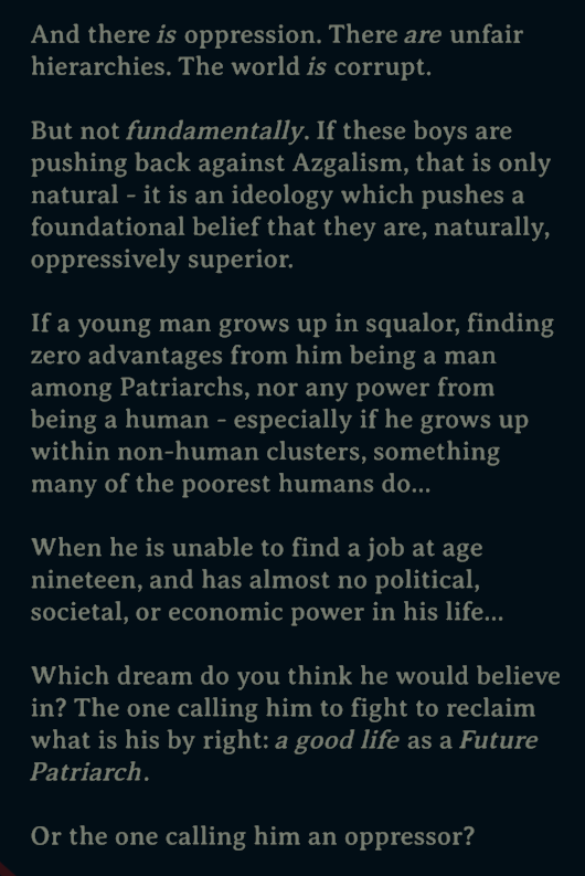>>3940680There are two wrinkles that make them suspect, sure – their role in the main plot and their cooperation with the Golden Horde, as per >>3940653 But after both of these twists, the game goes on to cushion them! The Golden Horde is, in fact, SUBVERTING the principles of the Revolutionary Freestriders by using their pull to stop all trade with the halflings whom they're currently oppressing. The best outcome of the conversation comes from telling the angel ambassador that free trade is non-negotiable and the international community will continue to supply the halfling resistance. Further conversations with Viira show that the grip of the Golden Horde Jews on Halfling Palestine is not as strong as they like to project, and that the Revolutionary Freestriders will continue to use free trade to undermine the Golden Horde.As for their role in kicking off the main plot, well, yeah, it's a pretty bad look. However, even here, if you talk to Meriadoc Moonwatch in the epilogue, he seems genuinely surprised by the whole thing, indicating that the whole thing was orchestrated by a cabal within the Freestriders as opposed to the entire faction, meaning that, once again, all you have to do is commit to the other ideal of the Revolution – free speech – to expose the corrupt oligarchs.All in all, Esoteric Ebb may have the most positive portrayal of capitalism and liberalism in a modern RPG. This is a very, very low bar, but I was impressed nonetheless.