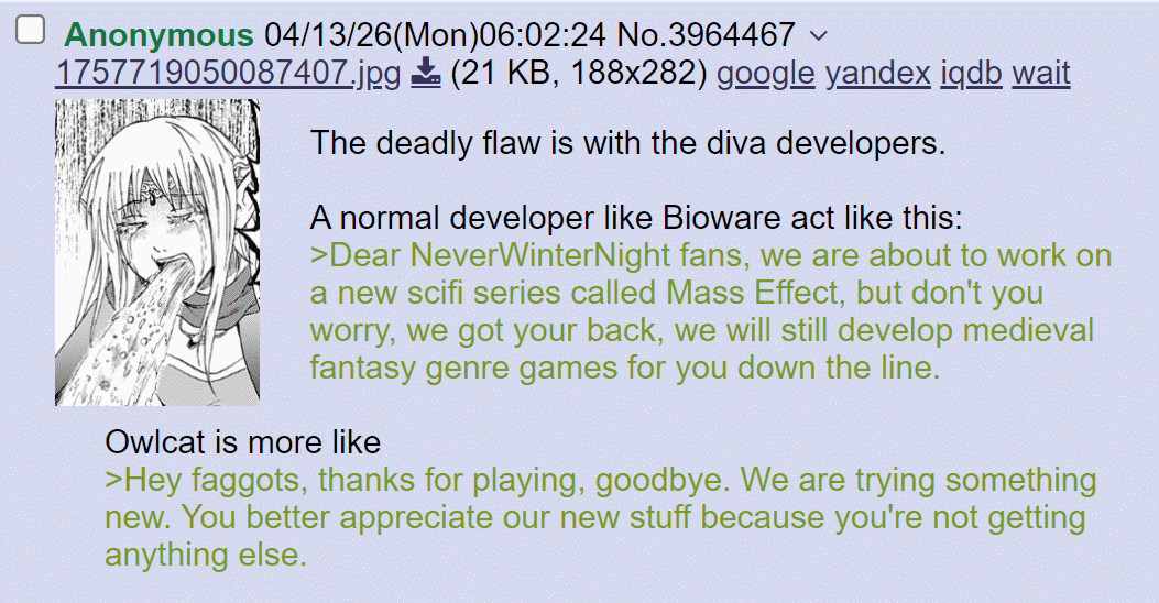 >>3947938You liked the DOS2 writing but you can't pay attention to the Wrath writing???Either you're lying or you need to make an appointment with your neurologist to get a brain scan immediately.