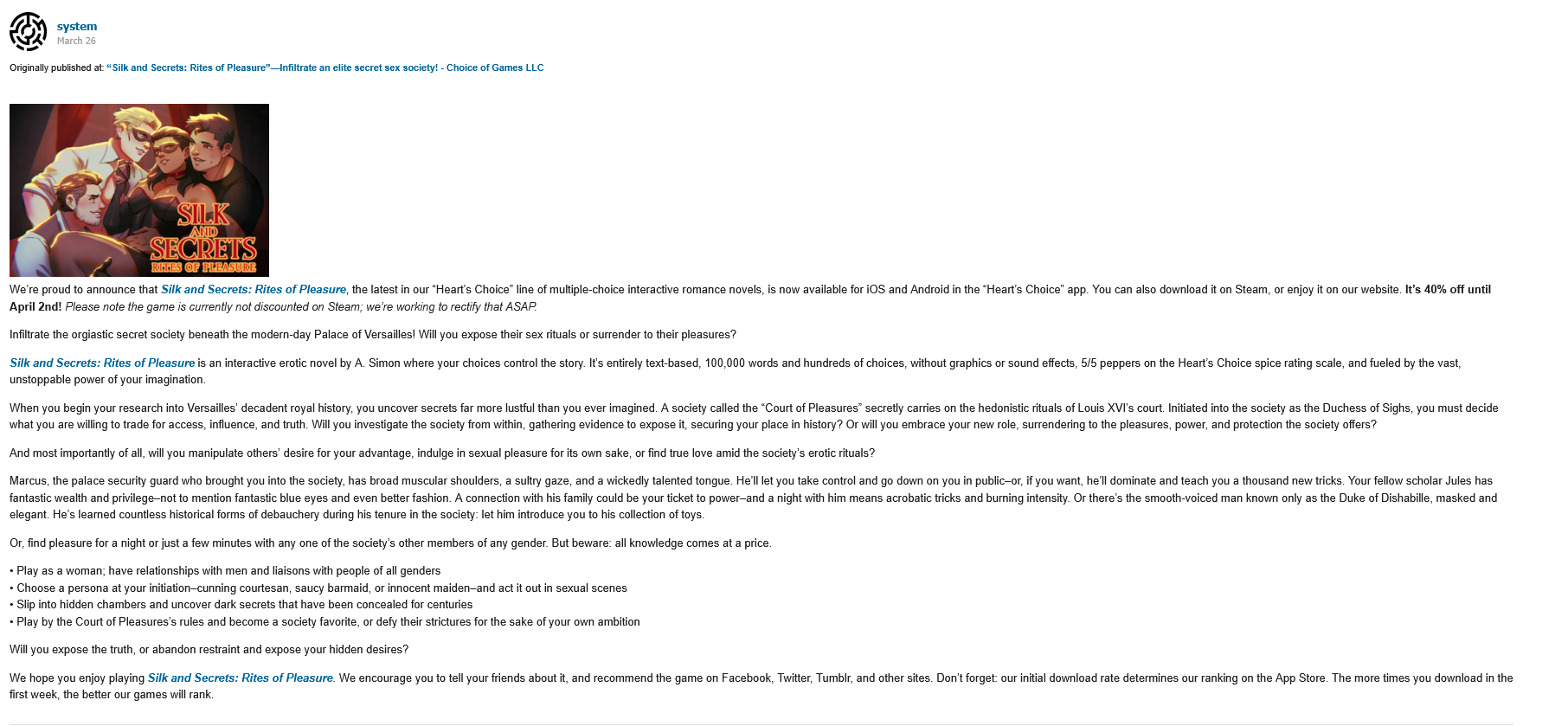 >>3951736>A society called the Court of Pleasures secretly carries on the hedonistic rituals of Louis XVI’s court.>Louis XVI, the same guy who had no mistresses and was shy even around his wifePox upon CoG, may die of AIDS.