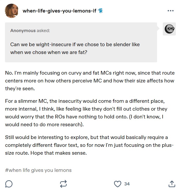Based Black female authors allowing us to make fat characters that are insecure about their weight!