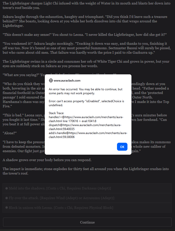 >>3956658That's the first bug like that anyone's reported. What OS/Device? And did it happen when you got to that scene or when you clicked an option on it? If you can export your save bundle and send it to admin@auraclash.com I can give it a look