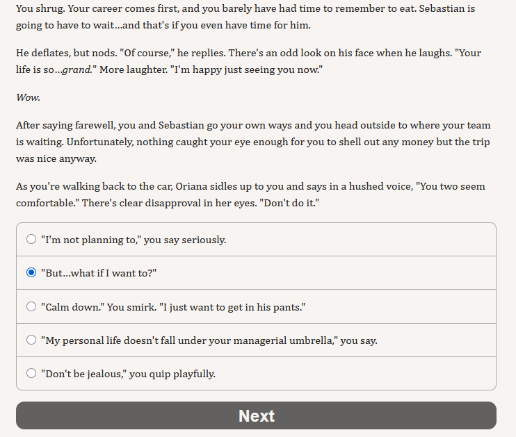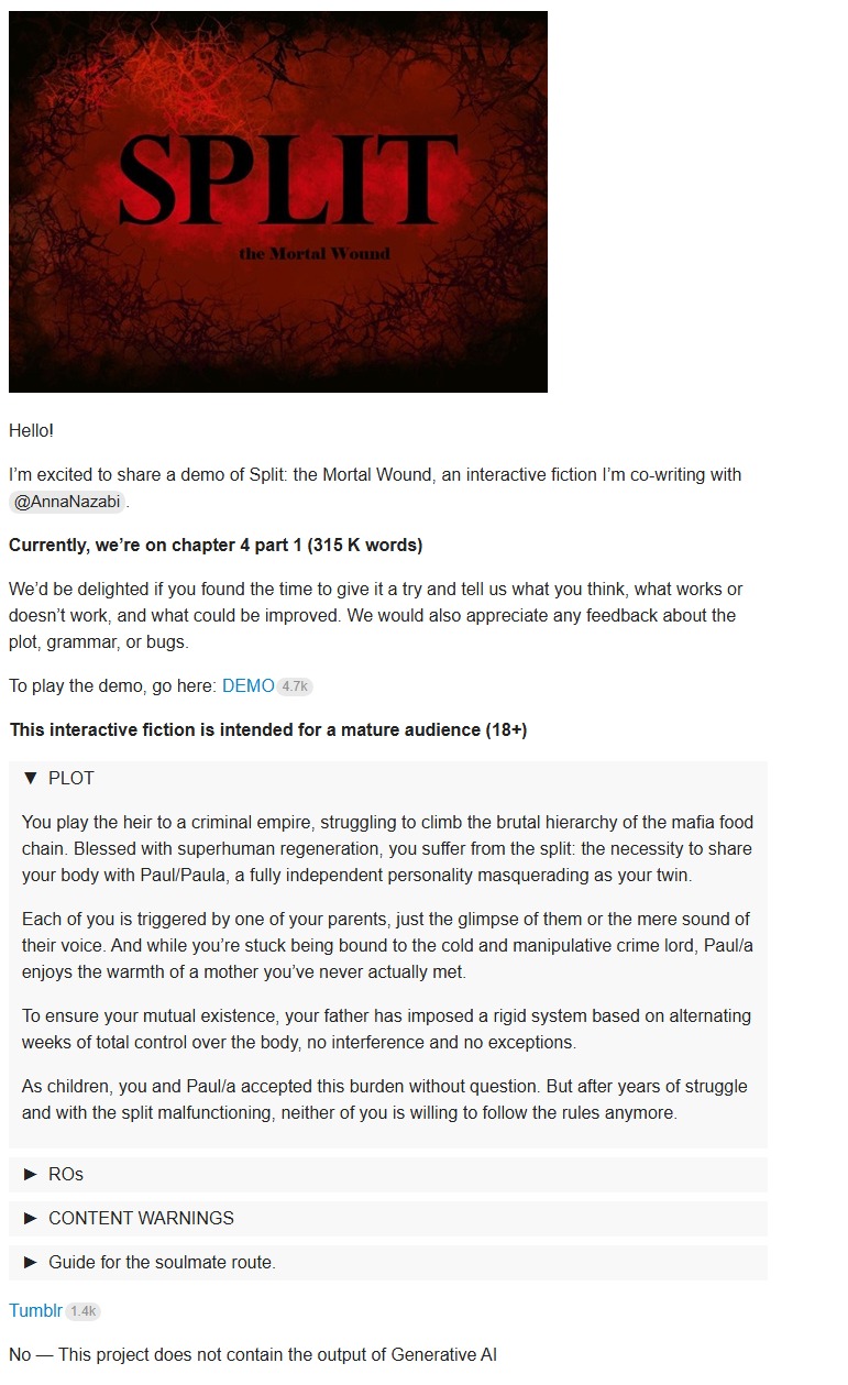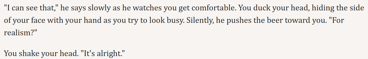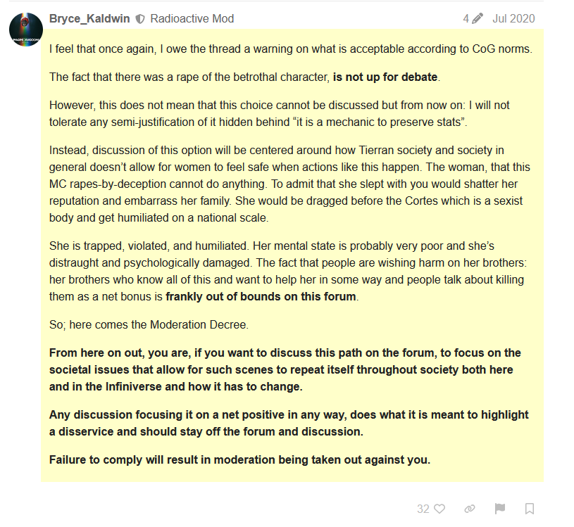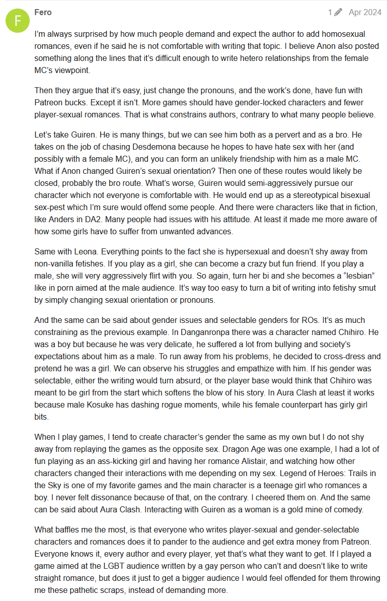 Going through the AC choiceofgames thread for lore tidbits and because I'm masochistic, and this great reponse to people asking for muh homosex really stands out. Of course, the next post right after this is a mod putting the thread on slow mode and telling people to not say authors only write bisexual characters to pander (as if it isn't the literal, objective truth - the entire point is it pander to as many people as possible).Anyway, I'm just really annoyed that all of the big IF sites are moderated by people like this.