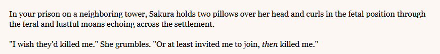 >>Mmf! Yes! Right! There! MMF! AH! YES! YYYES!!! OH GODDDS YESSSSSS!! SHEATHE YOUR F*CKING SWORD IN ME <3<3<3!!Games, IFs and CYOA where the writing isn’t complete crap?