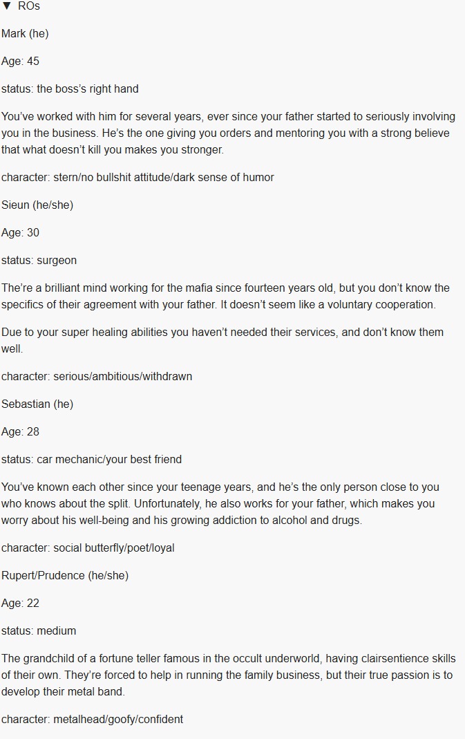 >Seven - slept around with acquaintances after you broke up, dunno if she still does this if you were just best friends in the past. also, black. without a description of skin color I don't think a single person in the world would imagine her as black.>Gina - body count of presumably 10000, I do not believe for a single second that she's purely lesbian if you make her female with the way she's written, also tattoos ew>Victoria - her initial description as plus size model has made me imagine her as fat all this time, I don't know if this is actually correct >August - unironically best "girl" by far, but every time I see her referred to as "they" my dick shrivels up as I remember she's a tranny>Oriona - 40 years old fossil like Ortega, and you find out she has an ex-husbandThe state of Infamous ROs is actually kind of grim. >>3975301Yeah this is sadly the same situation as Drink Your Villain Juice, where the author (probably deliberately) made the tranny the only good girl.