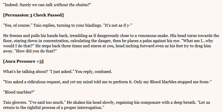 >>3966383>the checks are absurdly high and the fight goes on forever so you will eventually run out of resources unless you really minimax for it, but lowering the difficulty just makes it a cakewalk and takes away the funThat's why I mentioned porting it to a real engine earlier. IF is just ill designed for more complex fights. In typical ARPGs if the enemy is stronger than you, you can play better, react faster or maybe even flee and kite. In typical turn based RPGs you should be able to overprepare before a difficult encounter, or farm resources and XP in the worst case. In IFs you can't do either and the game forces you to follow the predetermined path and pick one of a small number of possible actions, and then punishes you hard for failing.The only IF game that is being widely praised for the mechanics is Aura Clash, and that's because Cultivator-anon not only keeps to his initial design while enhancing it with each update, but also keeps the game from going too hard on your ass.Funny thing is he was a newfag who discovered these games after our threads were already long established and the same newfag managed to avoid every pitfall in the IF design.