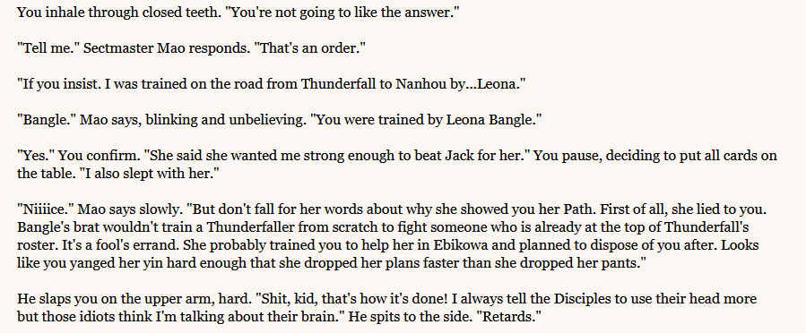 >>3966367Yes and no.Yes in that the game works on critical checks now, so in vast majority of scenarios you can either fail, pass a check and everything goes as normal or crush a check and the story reflects you effortlessly passing it.A difference between punching a guy and breaking your wrist, knocking him back for the fight to continue or caving his skull in and instantly ending the fight.No in that both exp and qi economy are royally fucked and even on the easiest difficulty you are sweating every expense. So the end result is people maximize the money they earn to immediately spend it all in part 2 of the game on the cheapest robe you can buy. You then turn that robe into qi from meditate menu so you can go back to the shop and do it again. Again and again tens, hundreds of times so that you can more or less have a fraction of the human rights someone using a console to max out his stats has.If you know what you are doing, it's "easy" to make a broken character that shits on everyone with the story reflecting that but it's unimaginably tedious.