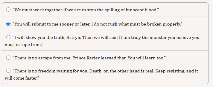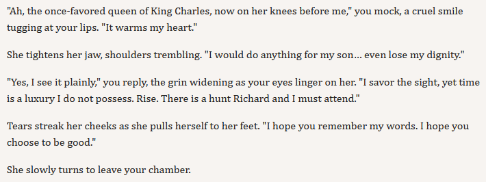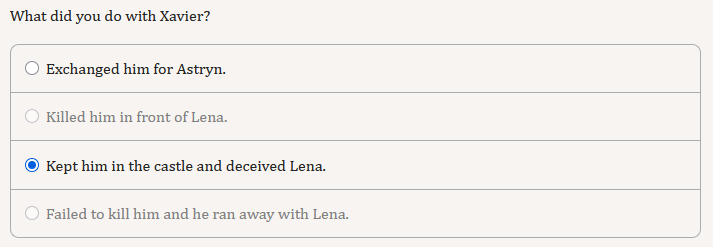 Alright, the chapter is actually hilarious. You can truly go full scorched earth. Betray Lena, starve Xavier, call for Astryn to be tortured, kill Richard, imprison Matteo and Isabella, execute Locke, ...And the funny thing is, I want to do it. I honestly despise most of these people.
