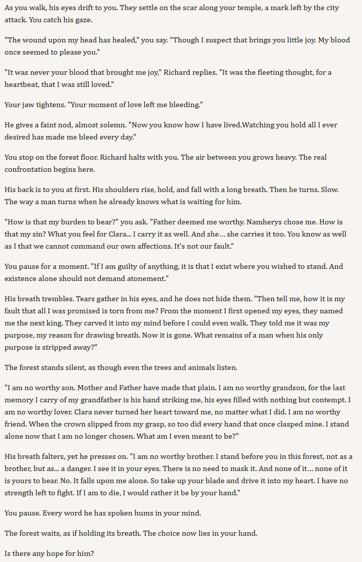 >>3974811The killing Richard route is basically a humiliation ritual for your mc because nobody seems to respect you and your decision except for the eldest sister. They don't even buy your excuses for murdering Richard and even the fucking peasants started to riot by attacking your soldier if you decide to parade his body. Everything went to shit..
