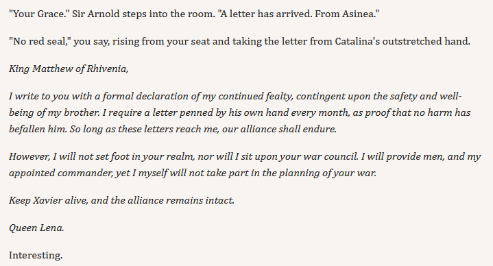 >chapter 9 for Rhivenia is outOh, I thought this was just a random Richard post. This part is hard to decide, honestly. Realistically, letting go of such a good hostage makes no sense, especially because Lena is a bitch and wants to secede. But I did hear people say she was the best RO in the old version.