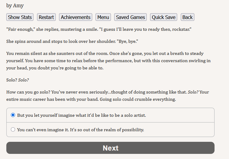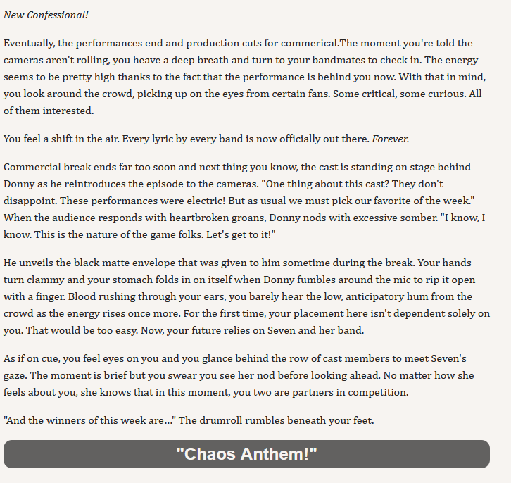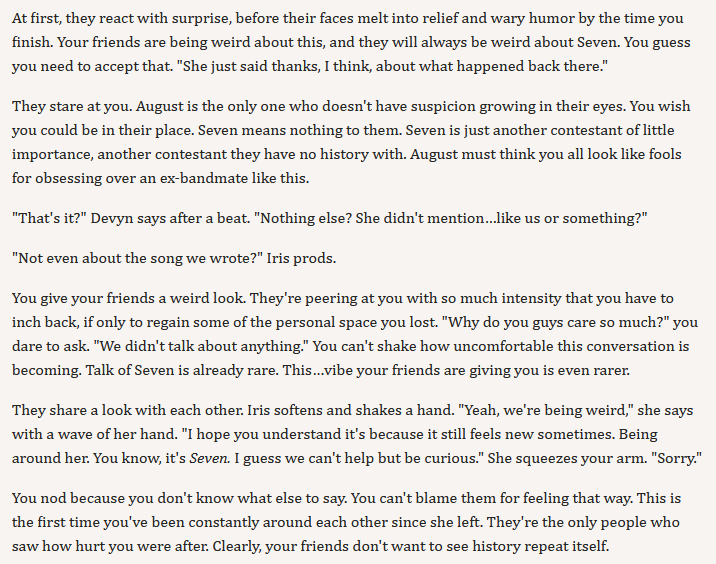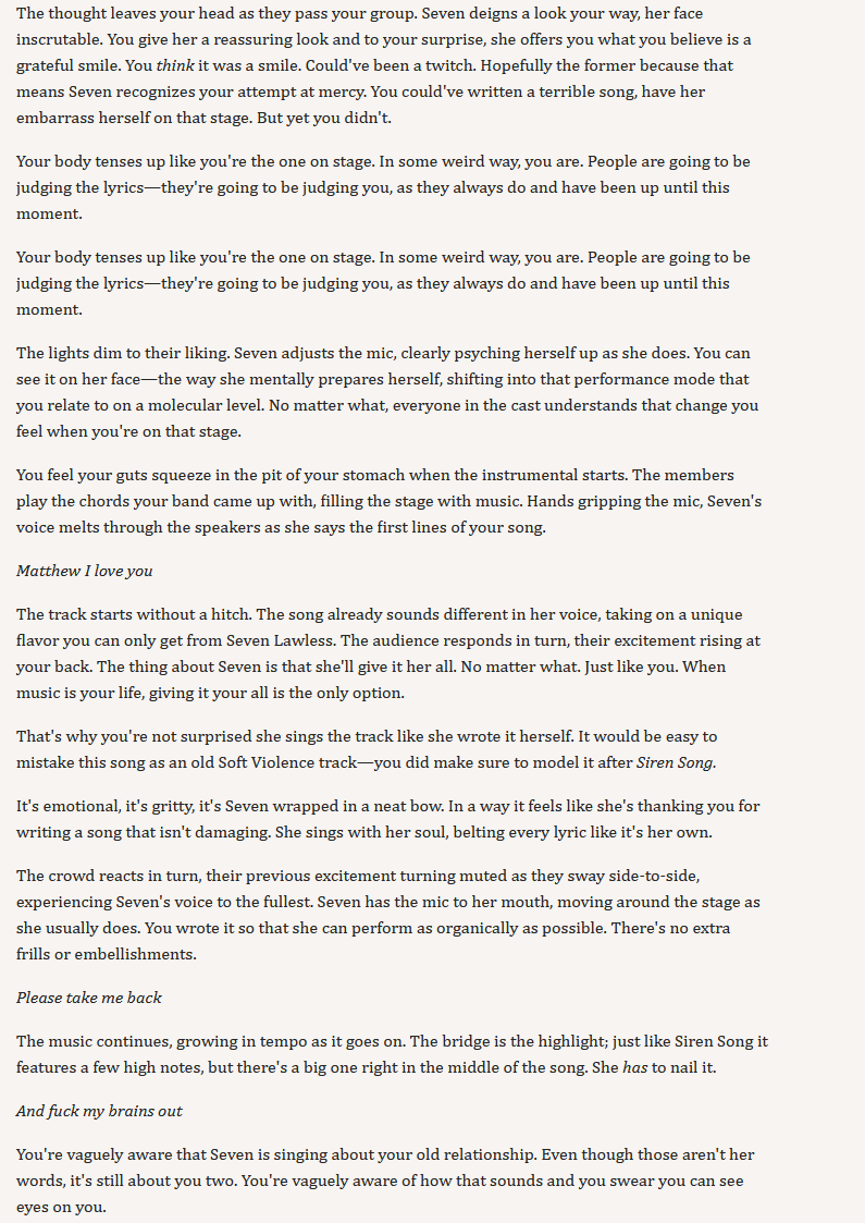>writing a song for Seven>chose to make something to benefit SV>only write in options>alright, just make a song of Seven begging me to fuck her Yep yep, this will be popular with the shippers. Honestly though, I think there should only be lyric snippets you can choose, because you can write an infinite amount of custom nonsense that wouldn't make sense or would lead to vastly different reactions.