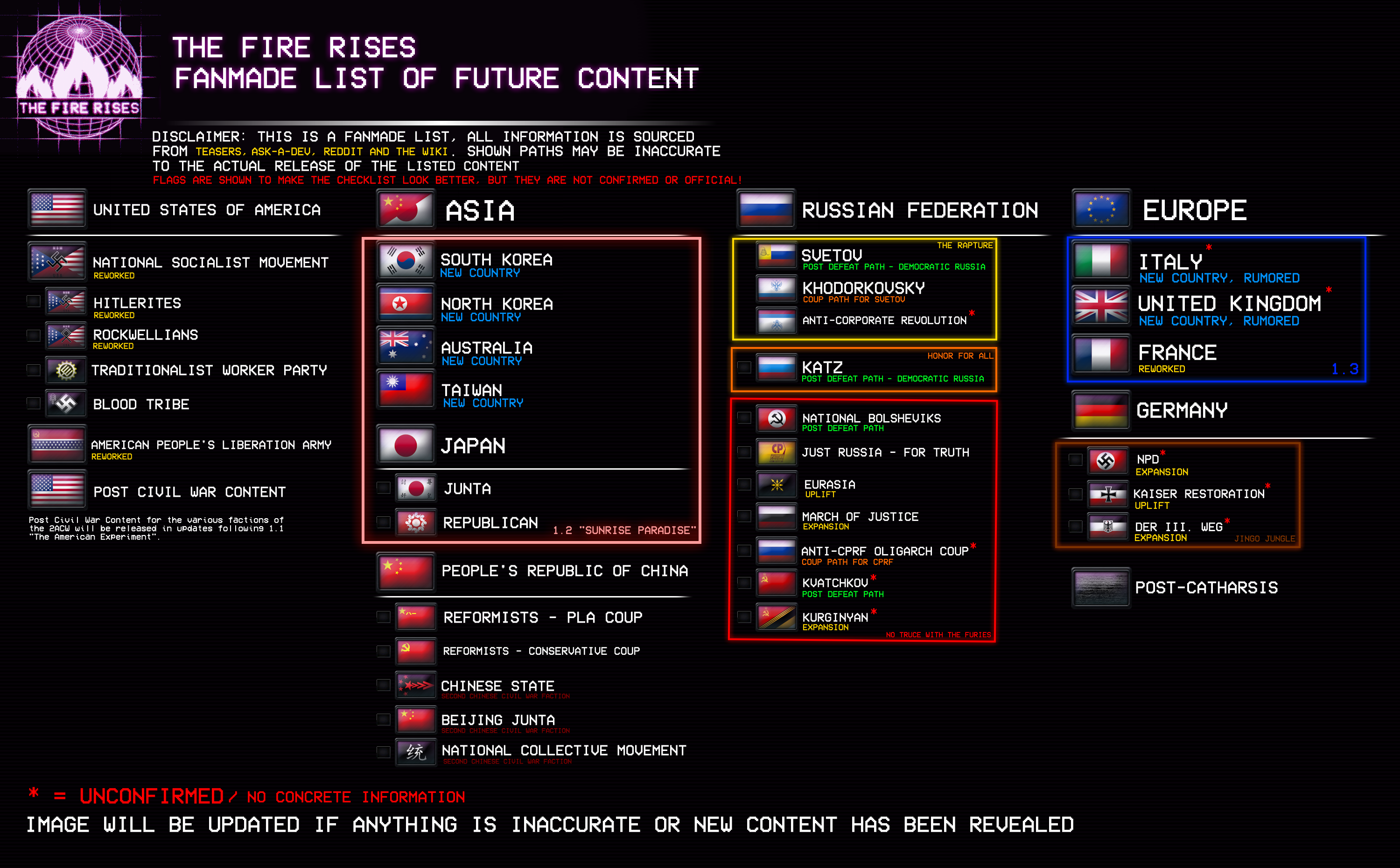 >>2329691They've said that they're going to be removing the tag switching for the French Civil War and when mentioning the Lafayette rework they say that "Europe stuff is still far away". Personally, I think that this kind of confirms a France rework is coming in 1.3Nevertheless, I'll add an asterisk next to France just because that content is so far off all we really have is rumors.