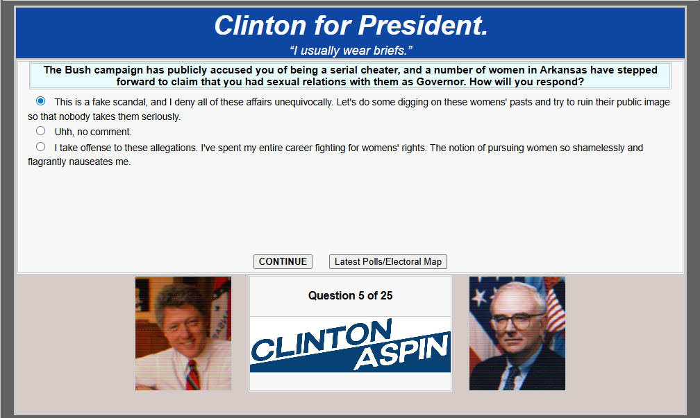 Talking about Bill, I find it funny that in Slick '88 there is a option to tarnish the credibility of the women he slept with, and not only does the mod not make any snide remarks about but it is also the objectively best thing to do.