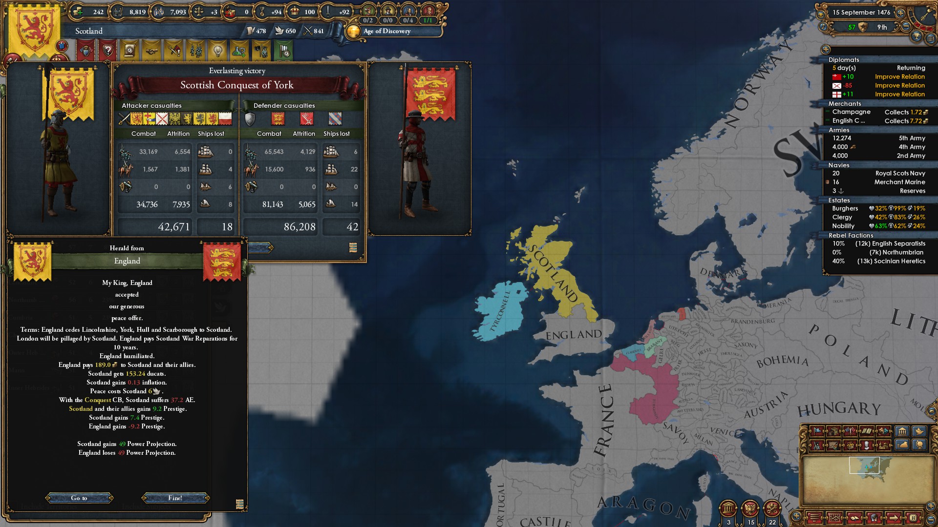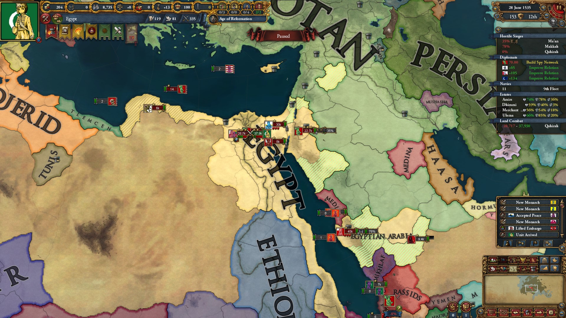 The good news is that it took me about 7 years to balance the economy.The bad news is that the Ottos immediately started integrating me as soon as the truce ran out. I can't find anyone to support my independence, so now I have to fight for my fucking LIFE. I'm immediately going back into debt to afford forts, ramparts, and an army. I'm equal in tech with the Ottos, but I know that they have like 115% discipline and I have only 105%. The only real advantage is that the Ottos already have 0 manpower, but they also have 120k men to my 44k deployed 40k reserve