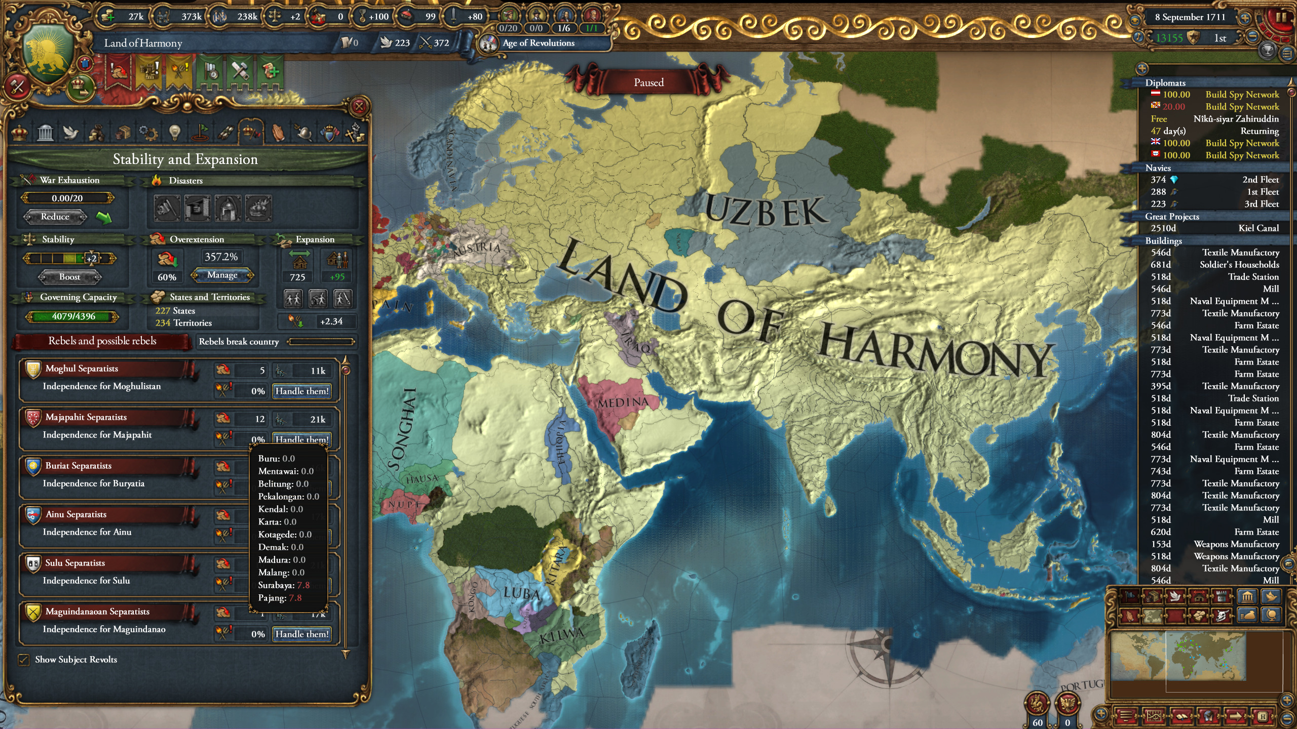 Confucian Mughals game. This is probably the max amount of unrest I get at 357% overextension :^)