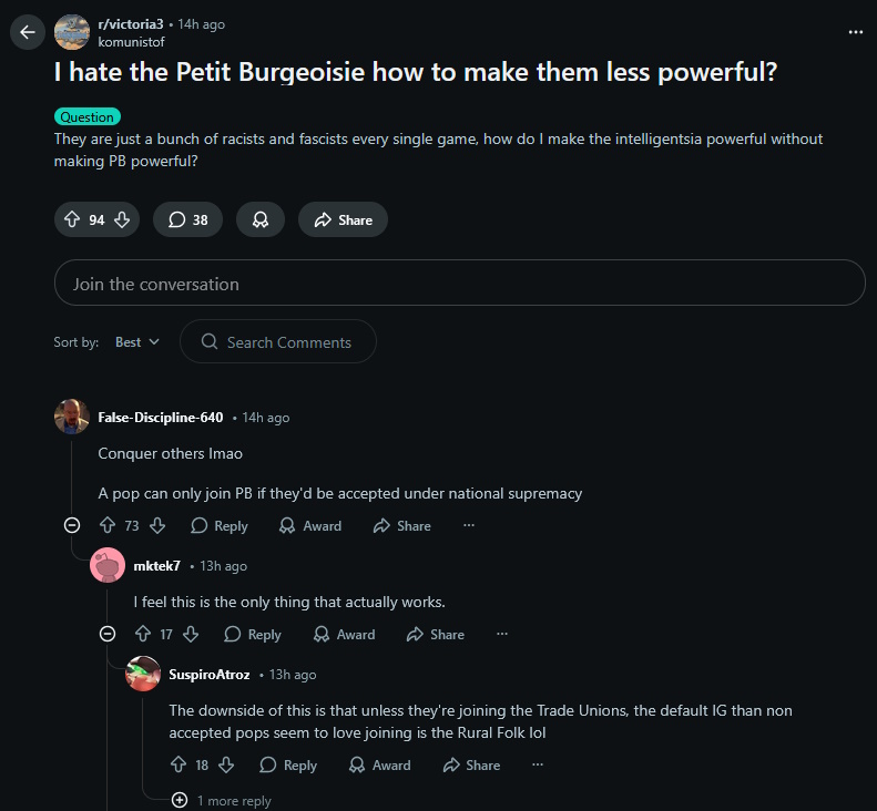 >I hate the racists and fascists>I want the [historically hyper racists but hyper neoliberal communists in this] in charge>>just imperial conquest to destroy national identity, lmao>>>yeah don't, you'll get a lot of rural folk, I hate peasants>don't take private schools, those are racist>>did you read the law? it helps the intelligentsia and public schools creates assimilation, aka creates more shopkeepers>>>yeah but it's racist(and one redditor believes it hurts when going wide because conquered pops can't afford education to get jobs... he doesn't realise unincorporated states have zero institution access)>organise IRL>>haha okay and I'll be suicided by 11 gunshotsI feel like my shopkeepers are always led by a democrat, a market liberal, a radical, or a feminist. Maybe that's because I don't specifically choose to piss them off. Maybe that's also the same reason why I don't get communist takeovers - it's too easy to please every group. And the less said about how the game models racism the better.Then again the OP of that is just pissed off Le Nationalist faction exists.