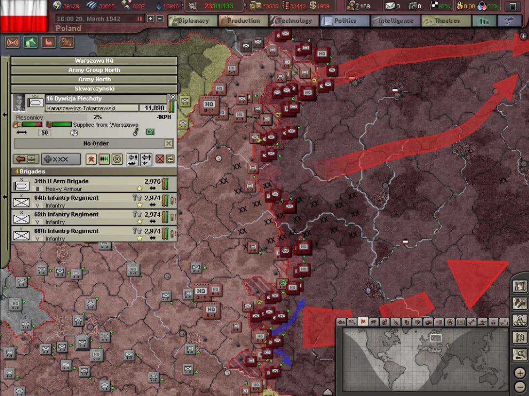 War against the soviets has started and going pretty well. Germans and Italy on their way to help. Using mainly Heavy Armour + infantry regiment x3, and armoured cars for later encirclement and breakthroughsPoland starts off with a huge army of infantry regiment x3 so its very viable to rush heavy amor, make lots of HArm brigades and attach them to each infantry division made of regiments