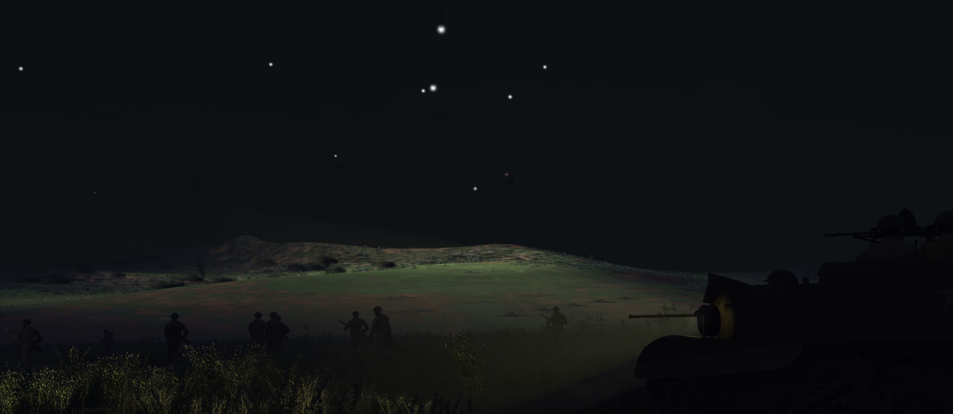 First defensive line illuminated by flares on my way to capture Longstop Hill.Concerned about how the Churchill's are going to cope with the climb.