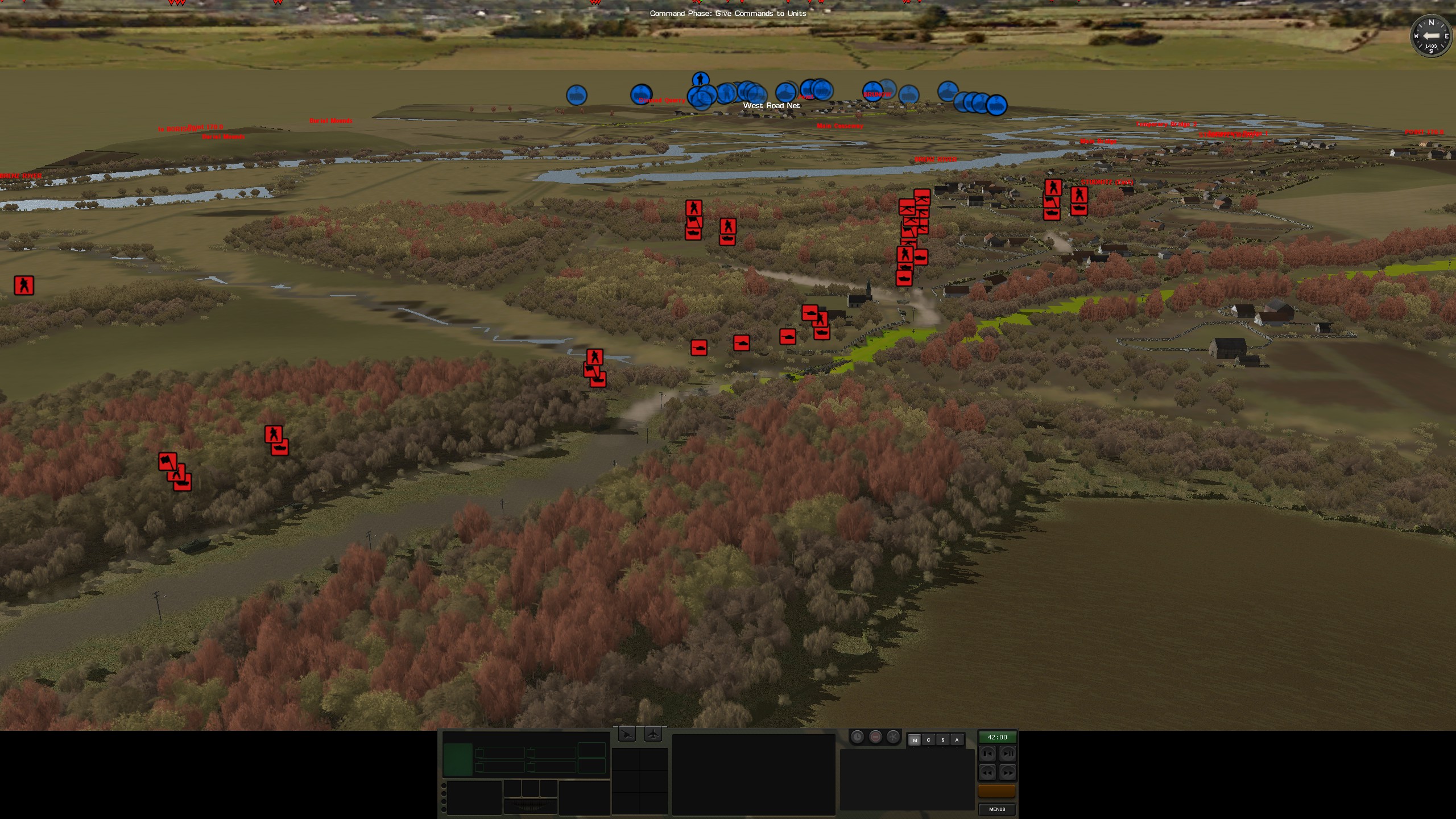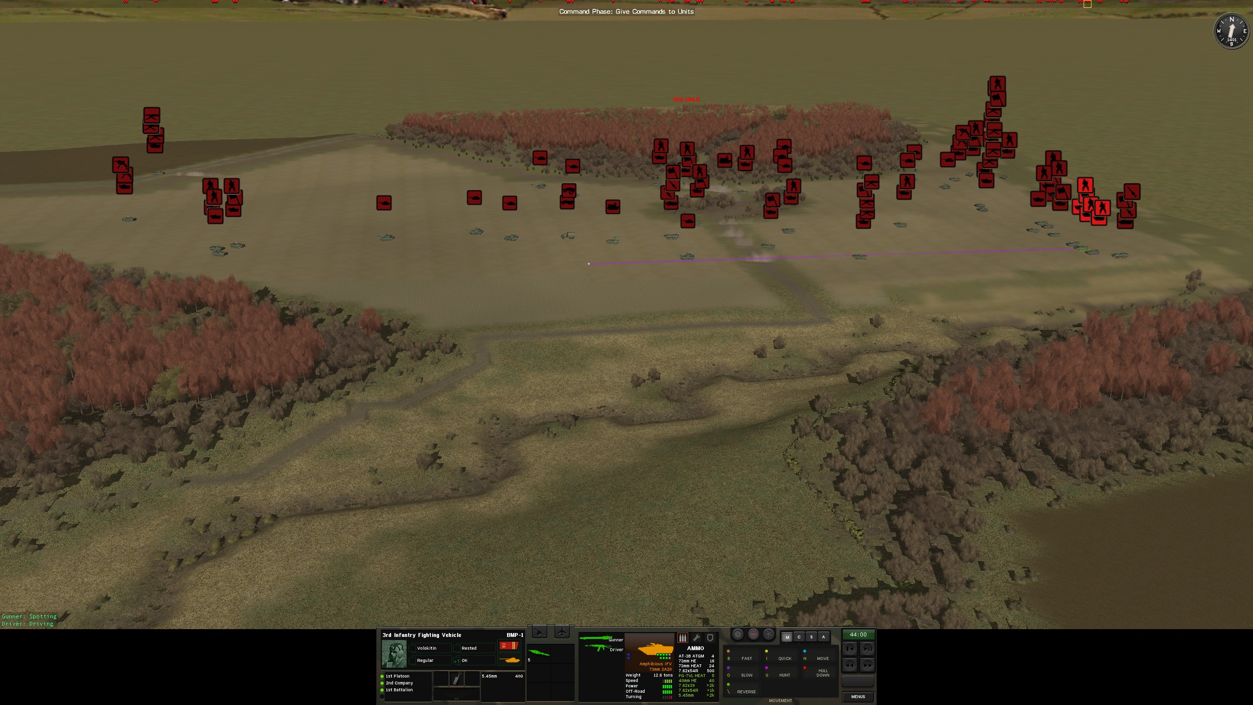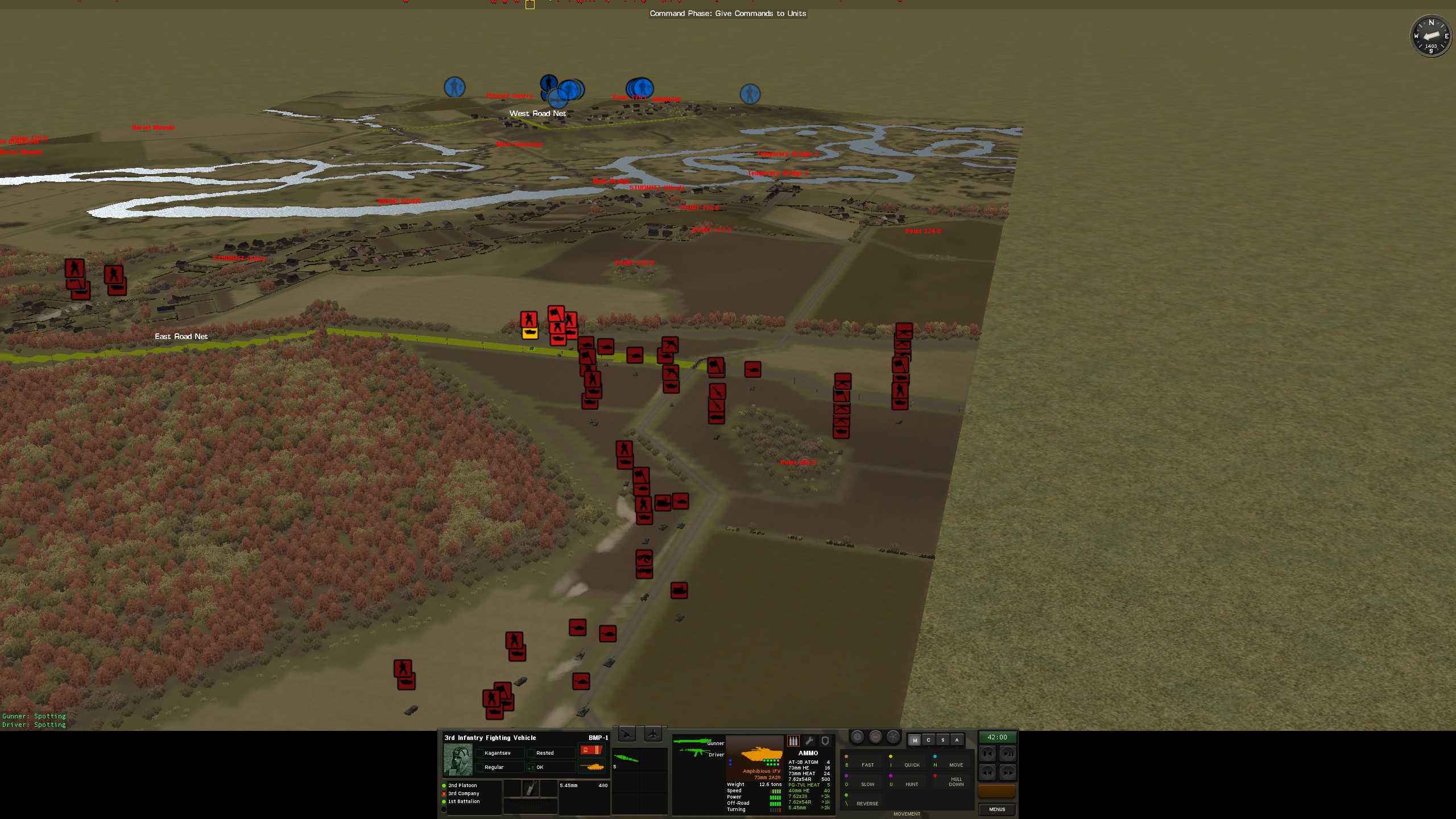 >>2319898This is the force moving towards point 178.9, as you can see CM has a hard time keeping things together with this many pathfinding vehicles next to each-other but whatever. I fully expect him to have a few tanks set up along West Road Net on his side, so we'll see where that leads. I brought no artillery except the on map mortars, and no air power aside from 2 Hind E that will be coming in 4 minutes. Couldn't screenshot the other force which is heading to the town from the other road because CM is a shit, but that one is more BMPs and infantry, I figure he'll try to keep his tanks out of the lowlands and open fields. Hopefully he doesn't look at this thread or I'm fucked.
