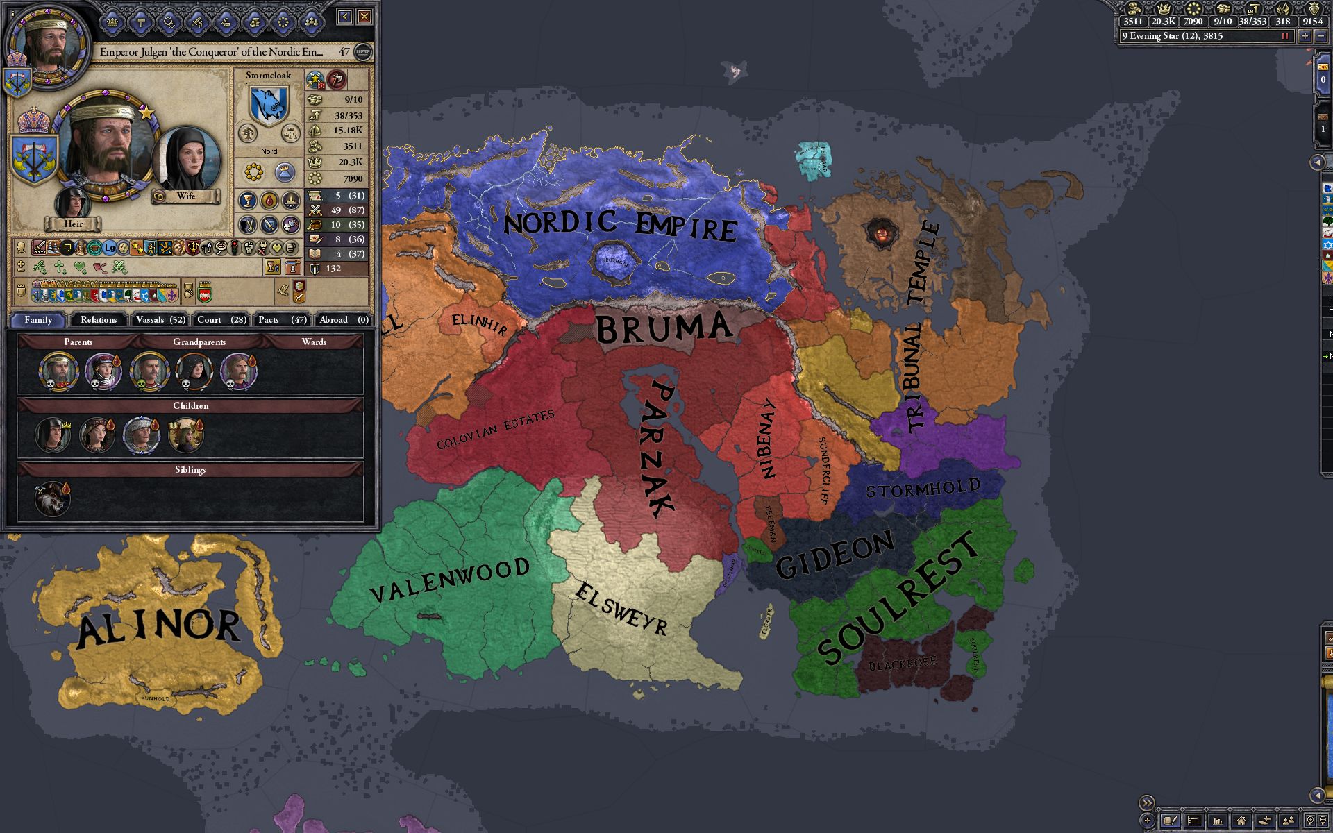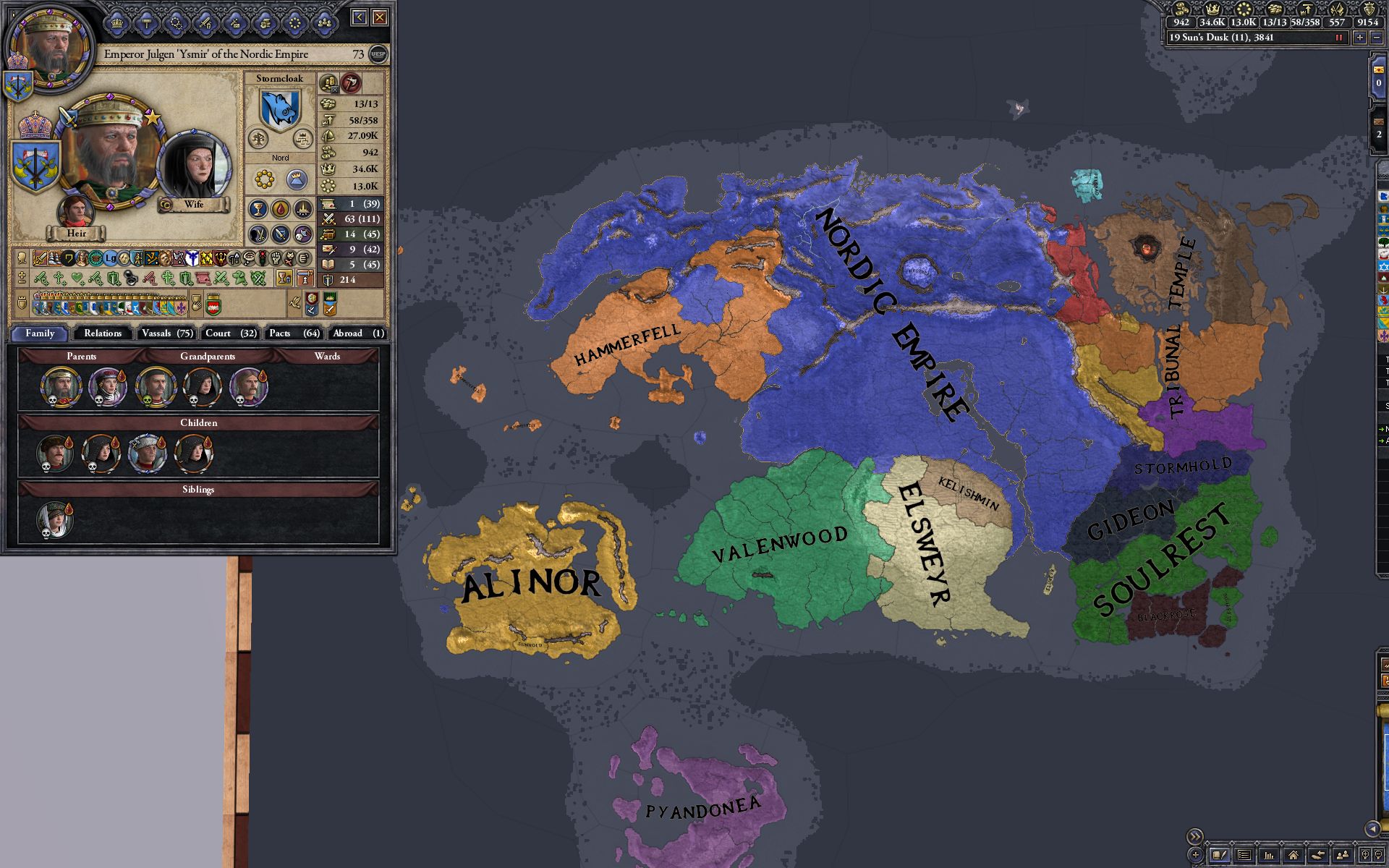 >>2305205The Eastern house (i forgot the name) was dominating its western neighbor before I intervened, but besides that Morrowind was a slog to conquer due to the Daedric legions. I had underestimated them and declared war on all Dunmer states at once, had to call in my Jarls to help me out there. Unfortunately I forgot to screenshot that war, I'd just wanted to get it over with. Here's the map before the Conquest.