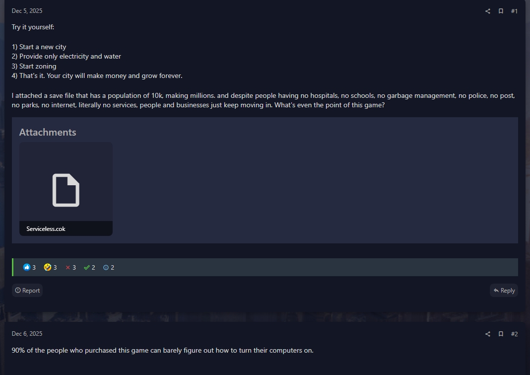 Is cities skyline better than cities skyline 2? I bought and played cities skyline 2 and I just don´t know what to do with it. The difference between starting with unlimited resources and normal mode is just time, nothing else. You don´t even have to fix traffic jams for your industrial areas to still make a profit, nothing matters, you will progress. I thought about making a city with only port connections, but at the end of the day, if the game has no mechanics, why even bother. How is cities skylines compared to CS2, can you fail at the game if you just do like pic. related? I just want a normal sim city game with updated graphics, it should be out there.