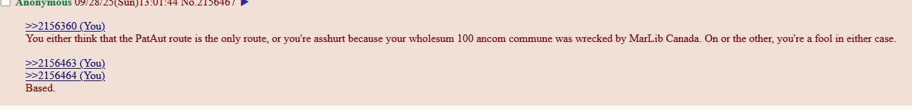You either think that the PatAut route is the only route, or you're asshurt because your wholesum 100 ancom commune was wrecked by MarLib Canada. On or the other, you're a fool in either case.