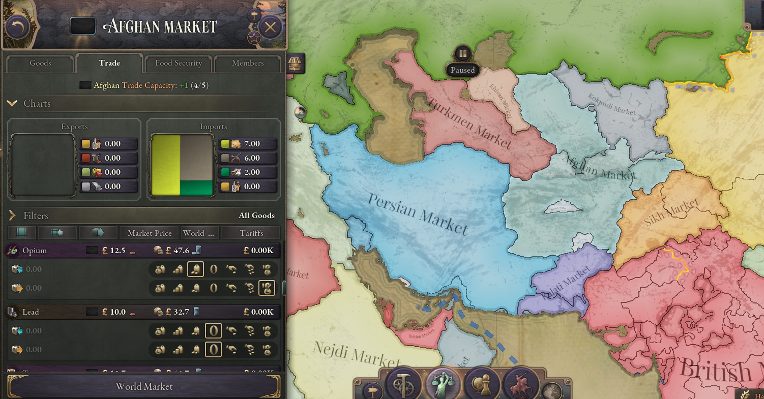 >>2169422"Market Access Price Impact"In short, prices are weighed based on two things, local consumption versus production, and market consumption versus production. Market being the national or bloc market.I am not sure how the international market interacts with this... as the bloc market was never made with the intention of free trade existing (treaty ports used to just bypass tariffs but not market access) and was, I assume, intended to be a millstone around the neck of larger, pre-modern countries, hence the traditionalism law fucking you up.