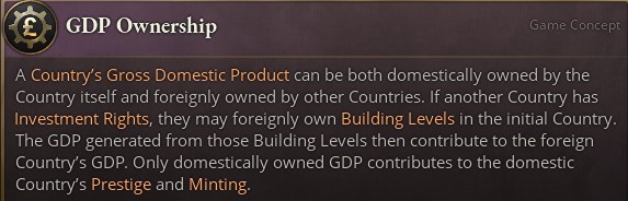 >>2168320>JapanYou WANT other nations to invest in you. You have WAY too fucking many pops to actually build places for them all to work on your own, and if you let them just remain unemployed, they will permanently shit up the country and ruin your game come ~1895 when they suddenly have a say in politics.>Letting them build shit in my country will end up causing me a big headacheNo. You still get all the goods access that you'd get from building the buildings yourself, which is the important bit, the profits just go to their pops' manor houses/financial districts instead of yours. All letting them build in you does is trade money your capitalists theoretically could have earned and it counting towards your GDP for score for someone else providing the construction. And you can just fix that later anyway by nationalizing their shit. Either by paying them off or going to war with them with a really easy wargoal. Likewise, you don't want investment rights in other countries, because then your capitalists/aristocrats will decide to build tobacco plantations in Nicaragua because they can get 15 prosperity instead of building a food factory in your own country that actually benefits you for 14. You want investment rights in other countries when building more buildings would be unprofitable but you don't want to waste your construction industry, which is never the case for Japan until very late (and is usually solved by just conquering Korea and Manchuria as you're railroaded to anyway).