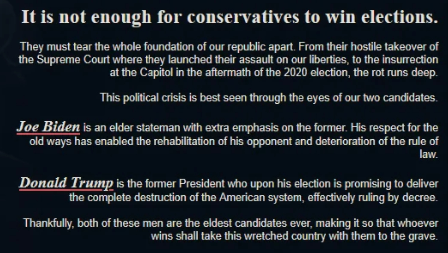 I don't think anyone shared this here before but Mango announced to the TCT community that he's retiring after his next Democratic activism piece to exclusively work on ruining TNO and turning it into TCT.https://www.reddit.com/r/thecampaigntrail/s/HeYD5i5ZCT>Before I detail what you can expect from those, I’d like to key you in on an open secret among folks close to the development: Project 2024 will be the last mod I develop for The Campaign Trail.>This has been the plan for months and months now, but I figured I’d make it public as to 1. Let folks who were expecting what the next thing I work on is (hint: it’s TNO America) down easy, and 2. Attempt to shut down some, weird, stirring drama.You're not getting off Mr. Mango's wild ride as he's now 100% committed to destroying the mod. Additionally from the thread a reminder that no the Nixon route will not be good and you'll have a very bad time by design.