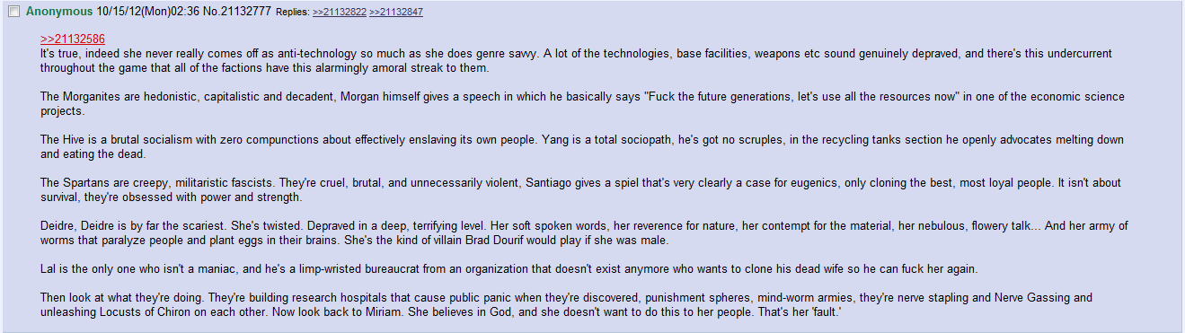 >>2171238>Miriam's lore and quotes portray her as an intelligent personAll of her lore portrays her as a religious nut. She demands blind faith and preaches against the kind of critical thinking associated with technological development because it threatens her power.Her character is intelligent only in the way that a charismatic demagogue is intelligent because she can convince a whole faction to follow her. I guess she's also intelligent enough to be pragmatic, because while her faction gets penalized in research (because she's loudly preaching against it) she's very good at stealing it from others because she still needs it as much as everyone else. The game mechanics seem perfectly in line with her characterization; a bullshitter whose quotes are made to sound convincing enough to keep the drones in line but won't stand up to scrutiny. If you think she's the most intelligent person in that world based on her quotes, you might be playing devil's advocate too much.