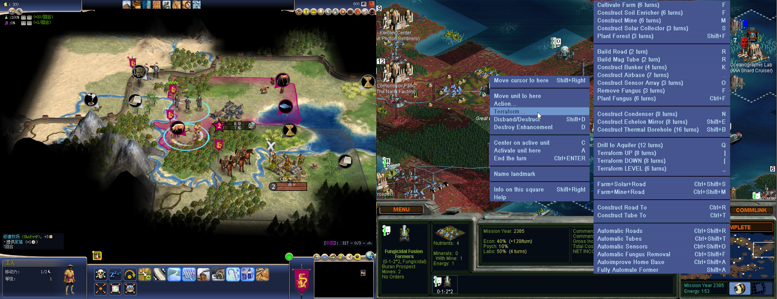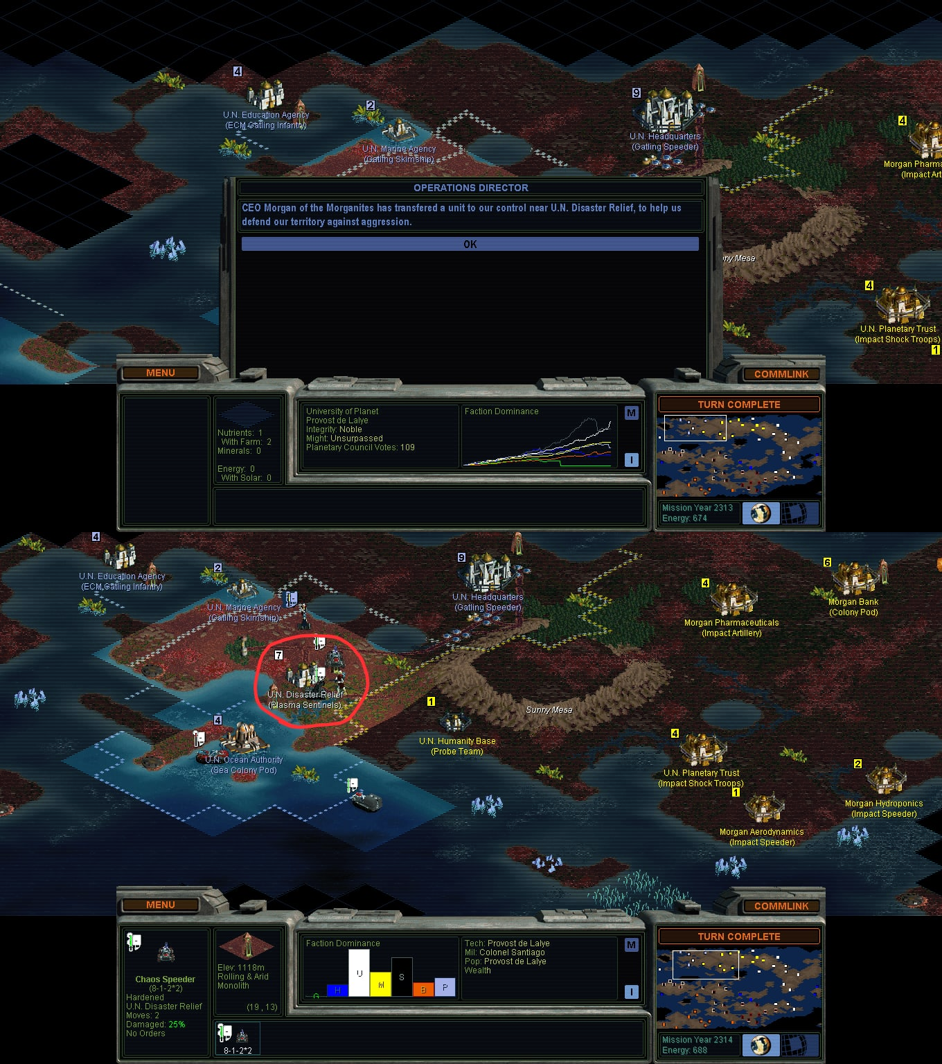 >>2257631The core problem, IMO, is still the UI not mechanics. Tile improvements in 4 are:- all available in the worker's action panel for clicking;- have clear icons;- provide info on what they do.Meanwhile in SMAC they are:- hidden behind two pop-up menus;- have no icons;- don't tell what they do - you need to consult in-game help or manual.Tile improvements in SMAC are definitely more complex than in 4 but if SMAC had the same interface, the problem would be gone.It's not terribly difficult to learn hotkeys but they require some adjustment time.>>2257678>need to make morgan and the spartans stop fighting since both are my neighborsWhat's the stratagem here? I'm not sure if the latter follows the former: Santiago is likely to fight you when you choose to adopt anything but power in values civics.