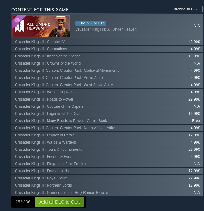 >>2171533They'll probably drop it once EU5 releases. Or some time after. I'll pitch them the idea of doing a reverse CK2, and releasing all the DLC for free, instead.Creative Assembly doesn't do this, and instead tried to pivot to a completely different genre, (because there is barely any money here) and it is absolutely NOT working out for them.