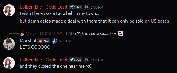 idek if anyone remembers this drama happened a little while ago, however i think its rather telling that this dude really does know small details like thiscontextIn late July someone decided to dox Requiems Codelead, and its possible that the codelead came on here and said "My relatives are working for the army bro"now, I am actually serving in germany right now (total cultural victory), and this little tidbit of knowledge, or rather even two, for starters even just what aafes is, but for another that taco bell is only on US Bases due to a deal, might lend more credit to what he said