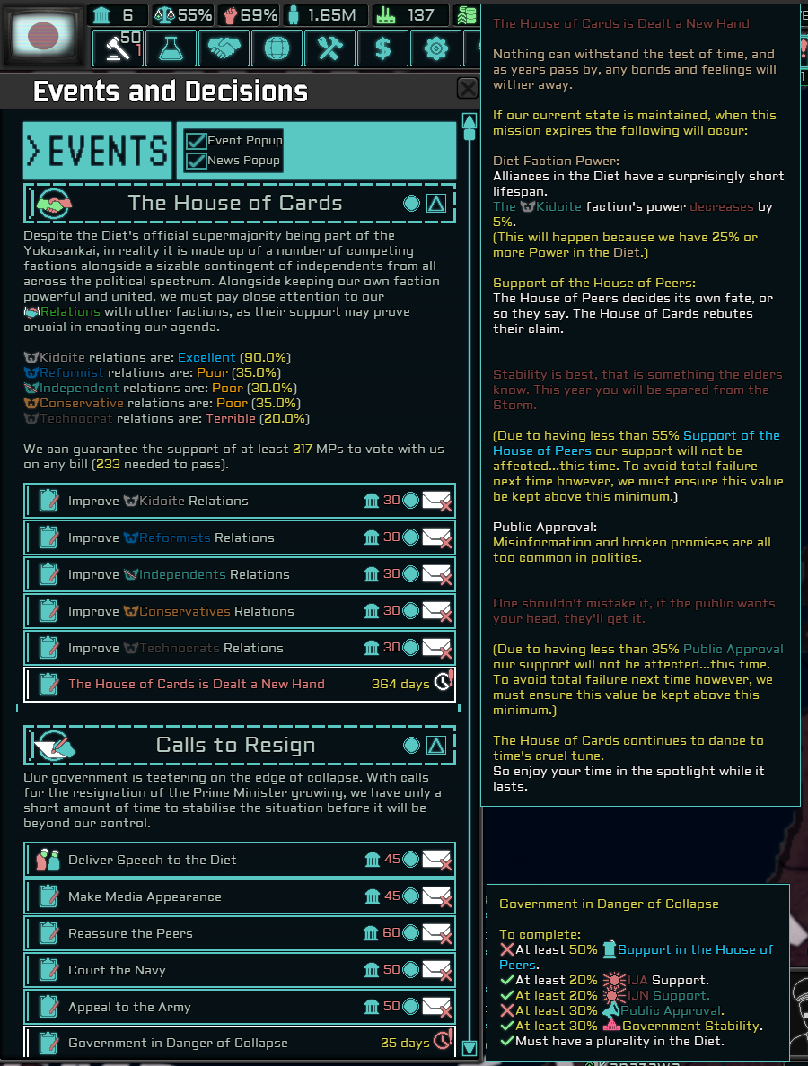 >>2175522Another thing coming is a Japan facelift>The Japan Facelift is almost complete, and mostly just needs a few tweaks for sanity and to make sure the new systems are totally functional. Takagi and Ikeda's trees are both in. I've put Kido's Interregnum path back in and managed to find the Loc for it in the old files as well. Besides maybe re-implementing the Economic War and a counter-invasion of Indonesia, the next bit of work will probably center on Kido. I'll try to find a good place for Konoe considering he actually has some manner of Loc which is very helpful (since the old effects on cut trees need to be thrown out or reworked anyway).>Here we have the fun part of Japanese politics, which is "getting murdered by a timer because proper balance is for suckers" and the total collapse of everything you've worked for. Eventually, you'll get a couple of paths from the transitions coming from those collapses. I've mentioned the transition trees, but governmental collapse is also how you were meant to get Konoe, Sasakawa, and Tanuka.