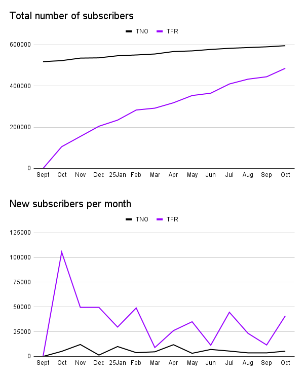 >>2176287>>2176321I feel like this post sums it up: >>2175830The difference couldn't be more striking. TNO celebrated its fifth anniversary making its most hated announcements to date while TFR has taken a victory lap after a strong year.