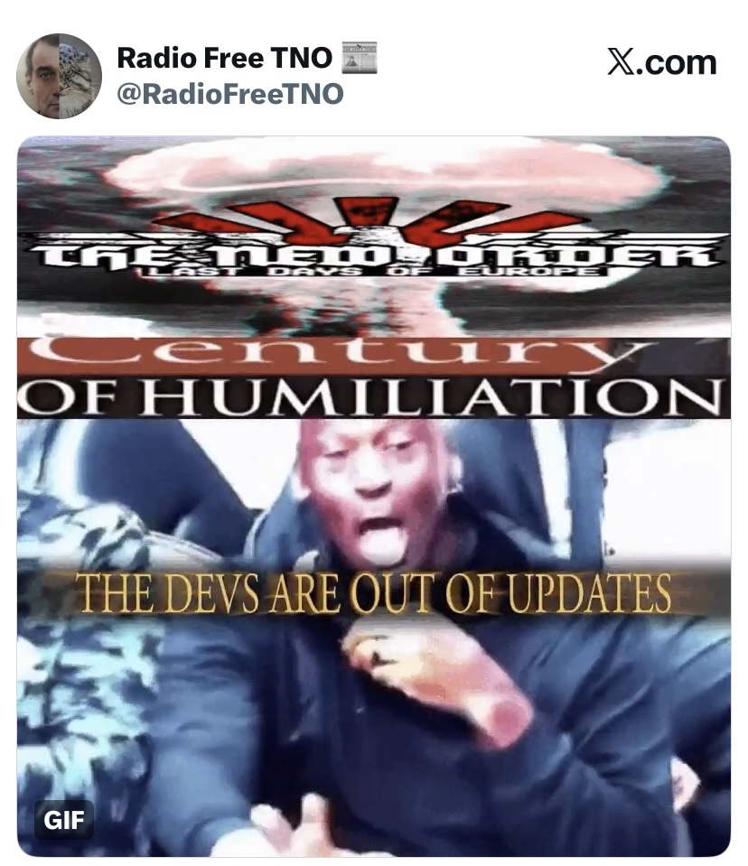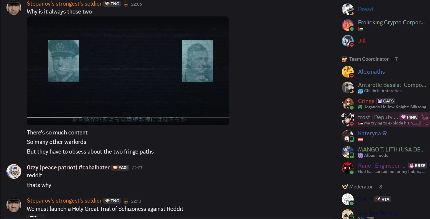 >>2176989I think Requiem is safe now. They survived all the initial attacks and seem to have overcome their teething issues following the split. Also Five isn't a dictator like Mango, just a sperg sometimes and the other people there are just normal for the most part. Maybe there will be missteps here and there but I don't think there's a risk of implosion even if South Africa isn't good. TNO is busy killing itself and is just being slaughtered by TFR so that trajectory isn't changing.As for the dox the guy seemed really low IQ and thought that Panzer still ran TNO but the less said about that the better.>>2177050Unironically yes. And it used to be the case when TNO did it too. Wordswordswords about interesting things like Catharsis or the best Russian warlords >>>> wordswordswords about nothing ever happening in Mexico.