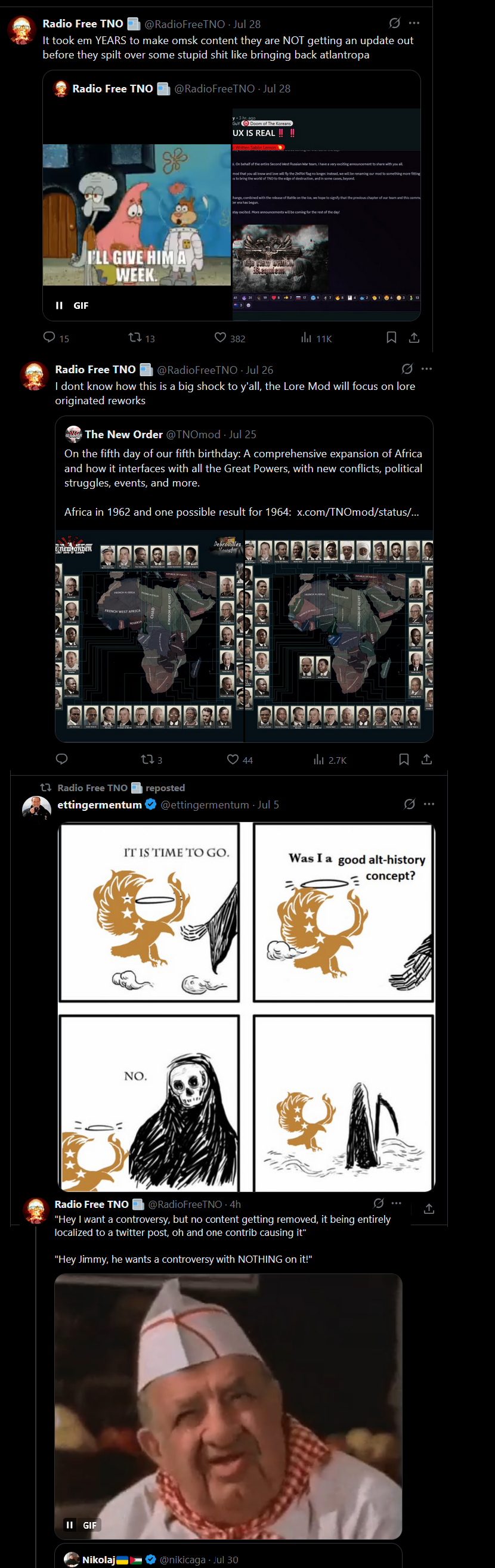 >>2174010one of these days we will get a down the rabbit hole on TNO. It's lying in wait, and I think it's going to be happening, so much endless retarded drama over a HOI4 mod and well documented too.