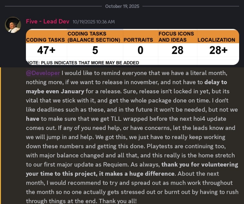 >>2181248Just goes to show that TNO is a very mismanaged mod. Nothing new there. Germany and America's reworks aren't taking longer to develop than all of TFR did because they're the greatest tags ever but because they're mismanaged by people that have no place running a mod in the first place. It's also interesting that 2WRW was also badly mismanaged when it was under the nudev spell but improved substantially when the nudev clique left.tl;dr don't let people that don't play HOI4 run your HOI4 mod, lmao.