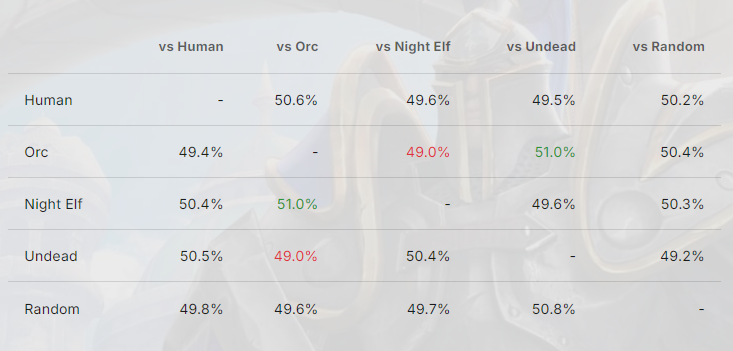 >>2204709>The game will be unbalanced at a fundamental level. You cannot escape this. Certain strategies will end up being stronger than others.There are degrees to a game being unbalanced though. WC3 has four different races so if it was perfectly balanced then win rates for each faction (assuming equally skilled players) should average to 25%, but is a marked difference between Night Elf having 99% vs 28% win rate instead of 25%. Even if a meta formed around the fact that one faction is clearly better and you only saw NE vs NE I think most people would agree that this means the game is unbalanced and not in a healthy state, thus a balance patch is warranted.