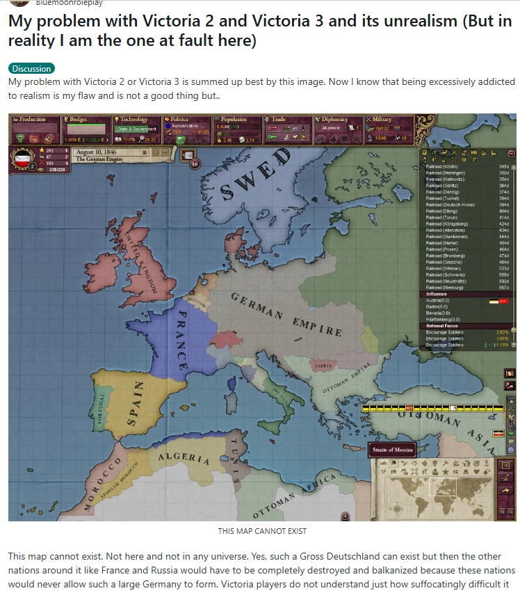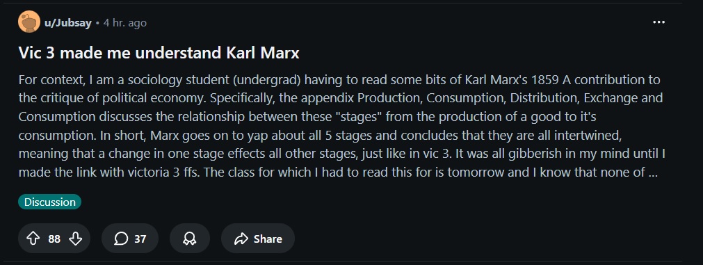 >>21820213 actually deals with politics better than 2 did.In Victoria 2 your pops could have all their needs met and if you didn't have the reform they wanted they'd be mad. Equally, they could live in squalor but as long as they had their heckin' democracino they'd be happy.In 3 on the other hand you can run an oppressive dictatorship as long as the people have their bread and circuses, equally you can have every reform in the game but if their standard of living is low they'll still become radicals