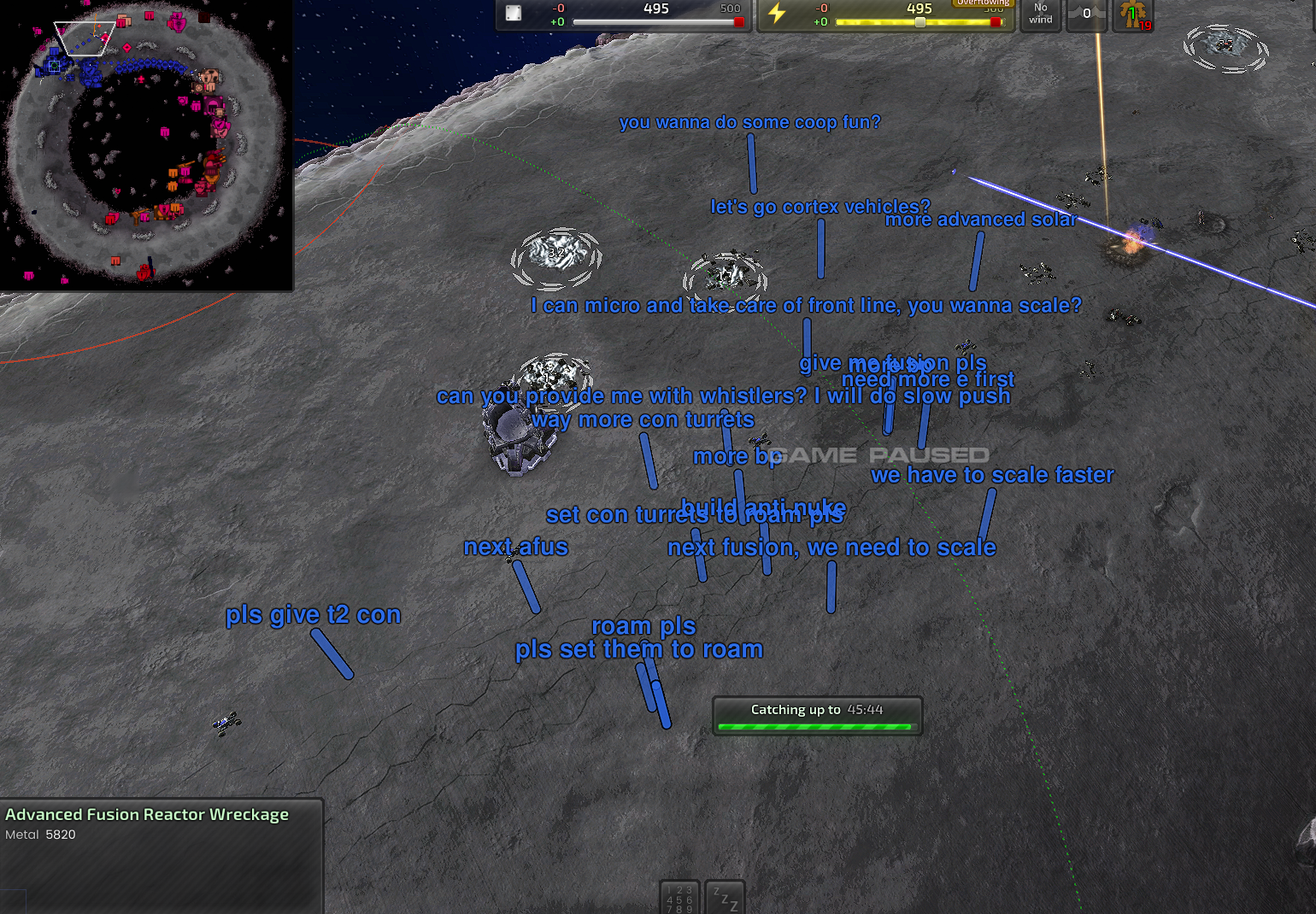 >>2208245>only person posting in the BAR thread is a zero-k player who wants to cancel the gamekinda funnyso many unit commands. at first I found it strange that only artillery units could use attack area but then I realized its functionally is exactly the same as attack line. the units don't randomly select a position in the circle, it just assigns each unit in your group an attack location marker the repeat toggle is probably my favorite functionality. automating transport drops and unit construction with combat engies feels cool. I wish there was a better way to automate repairs. I've been playing bots and using lazarus/butler bots to keep a welder push going but it's annoying to micro the positioning of the repairs bots>play scavengers with a friend>get completely fucking washed each timedamn this mode seems unforgiving. I assume there's some strat that trivializes it and it's a nightmare otherwise?>watch a beginner's guide>it talks about player's roles in team games and that how you play is predetermined by what map you pick and where you startwell that seems lame. is that really how multiplayer plays out?