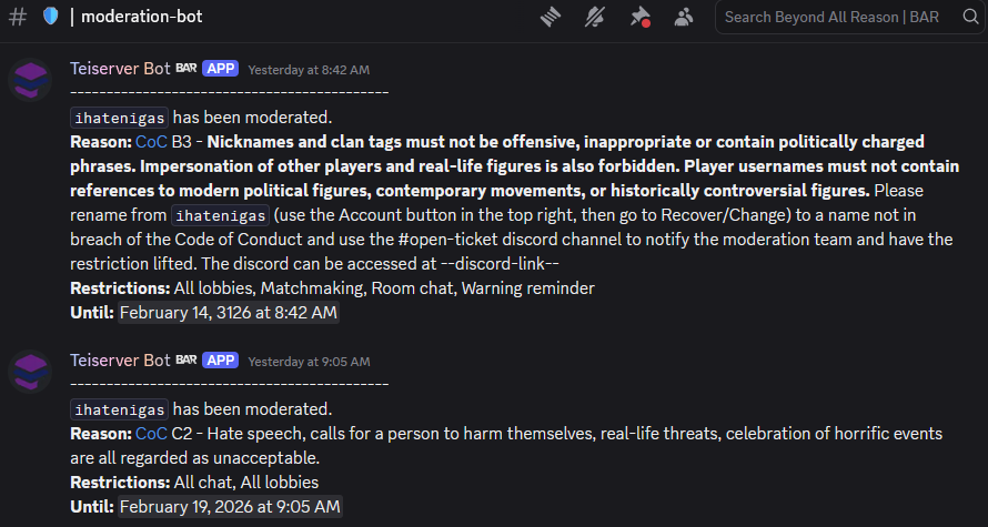 >>2317814>just host your own matchmaking servers for all your fellow nazisBAR devs have disabled private servers. You can !lock your which effectively makes it private (nobody else can join/observe) but you still need to be signed in to their service to do so, also, BAR admins can still access locked games and they have been known to ban players in said matches for private comments they deem inappropriate.