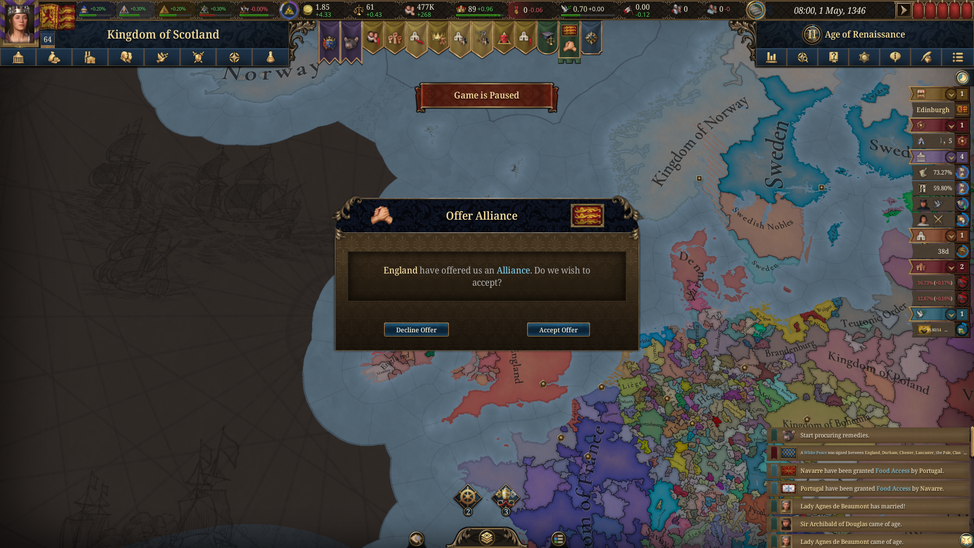 Bear witness to His Majesty William IV, King of the United Kingdom of Great Britain and Ireland, and of France and the Iberian Crowns of Portugal and Castile; Grand Duke of Savoy; Duke of Normandy, Flanders, Aquitaine and Hainaut; Lord of Iceland and manifold other locales; Defender of the Faith and Most Righteous Sovereign.Honestly I'm kinda on the verge of giving up this run because I got these unions entirely by accident and they've made the game trivial. I won the Hundred Year's War on purpose, and I got Savoy on purpose also. But Castile was in a union with Portugal and they fell into my lap entirely unintentionally, and now that I have both there's just not a force in the world that could ever beat me.