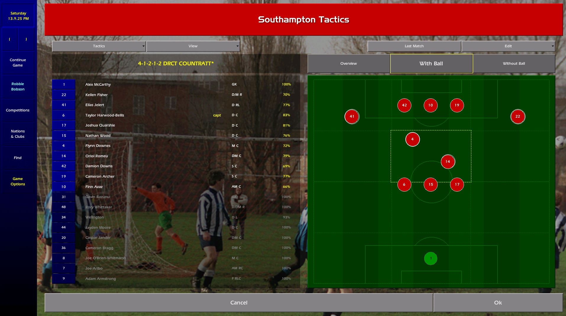 >>2308408Thank you, been thinking about returning to this game for a while. Took me a few attempts but i finally have it running in 1080p with 25/26 database. Managing Southampton to get them back in the prem.I forgot how great the with ball and without ball positioning was, it's possible to really create interesting and original tactical approaches, and makes it easier to counter specific threats your opponents might pose. Don't miss the awful 3D match engine at all. I only view 2D but even that ends up shattering any faith you might have in the way tactics manifest in matches. Text is comfy af.Masterpiece.